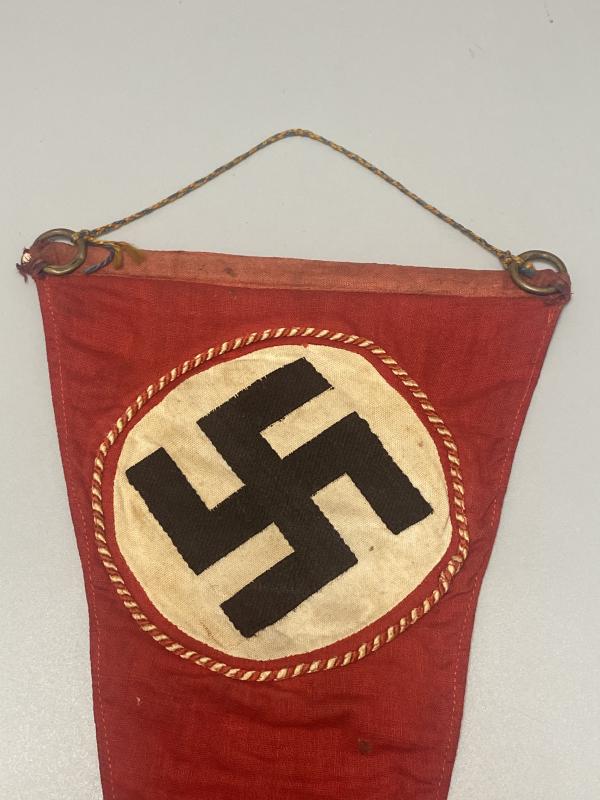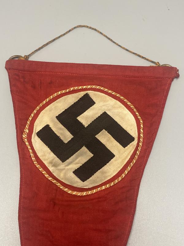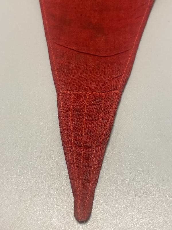 Original third Reich sympathisers pennant with a double sided bevo swastika on red cotton. Machine stitch work reinforced to stop any fraying to the cotton. A nice original piece. Approximately 16cm across the top and 30cm long.