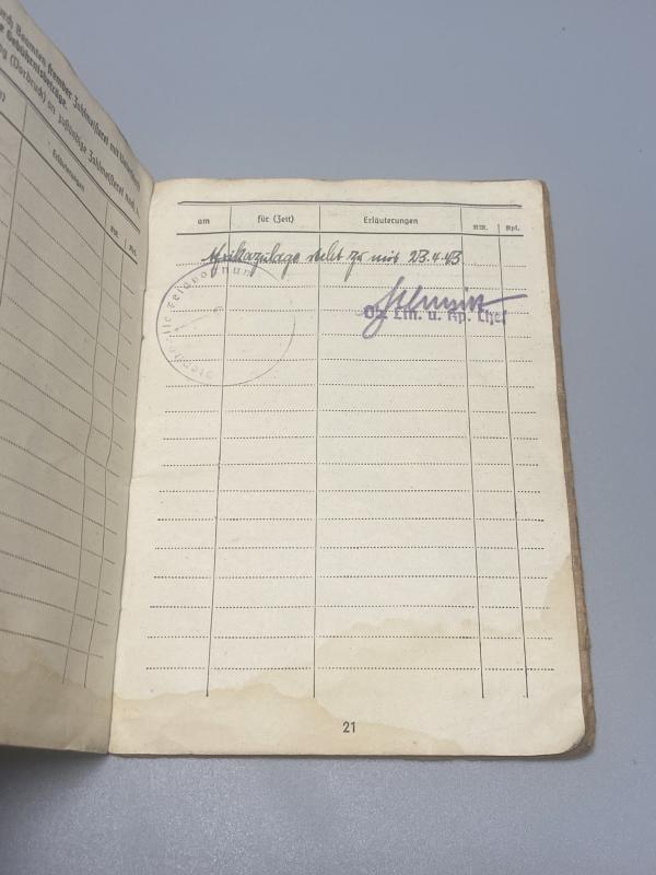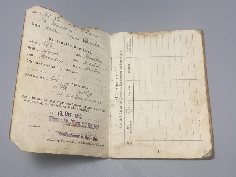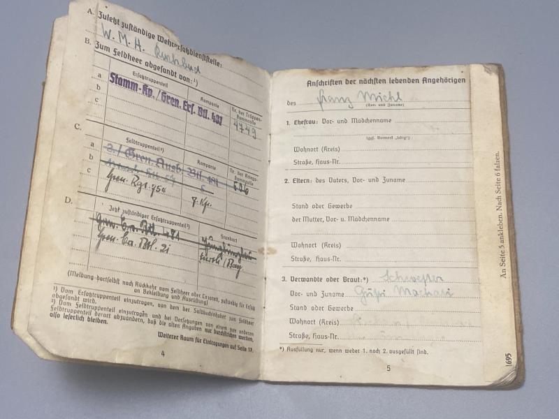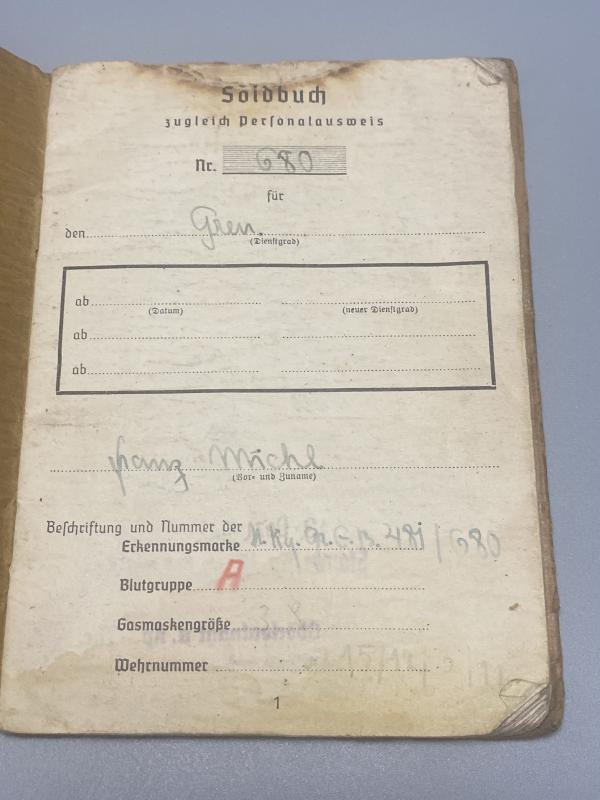 Original German army Soldbuch to a Grenadier Franz Michl. Entries date to 1943. Soldbuch has never had a photo with it. Some minor damage to the outside of the book.