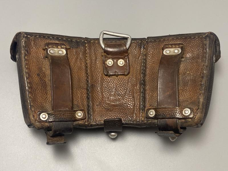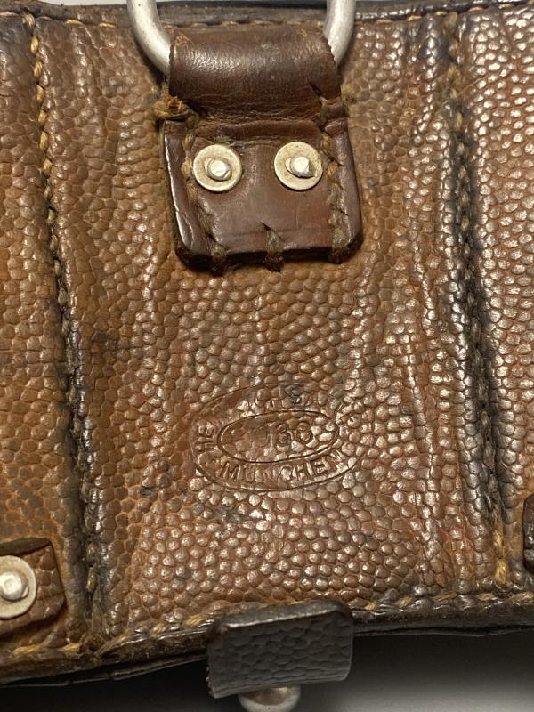 Original K98k Blackened leather ammo pouch dated 1938 by a Munich based manufacturer. Pouch is complete with all three of its internal dividers. Leather remains soft and in good condition.