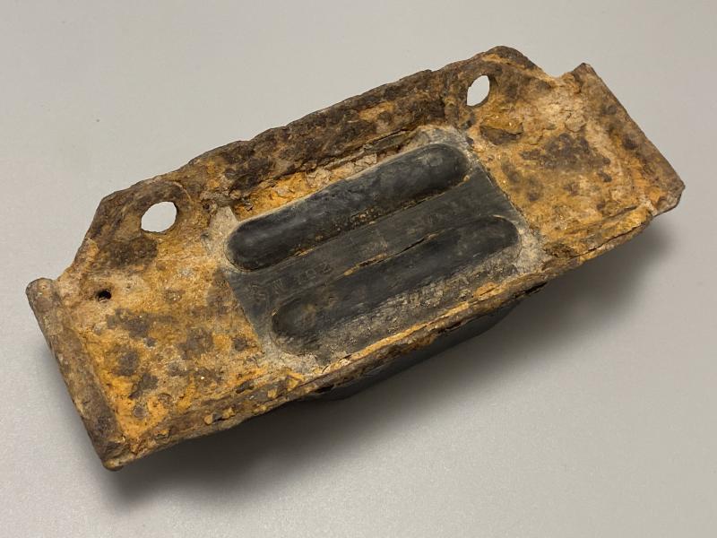 Original barn found Sd.Kfz.2 rubberised track for the Kettenkrad, a light German service vehicle with a single front wheel controlled by pivot handlebars and a tracked rear for two passengers. These vehicles were made in there thousands and issued on all fronts as mostly recce parties and used to carry ammo to frontline troops from supply. This track has a metal base and hard rubber cover. Four holes would be used to bolt it to the track. On the underside a factory stamp is present and date “42”. The track rubber measures approx 18cm long by 7.5cm.