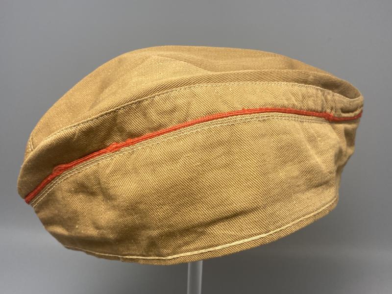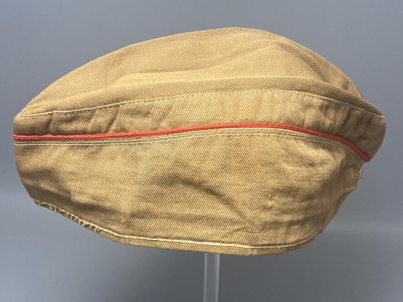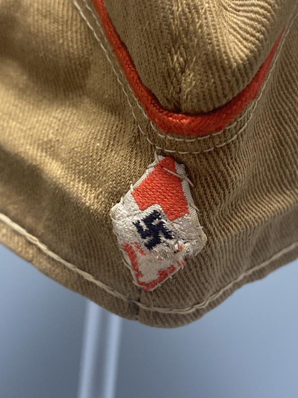 Original Hitler Youth summer field cap with red piping and period applied HJ diamond. Nicely worn example. No leather sweatband or label.