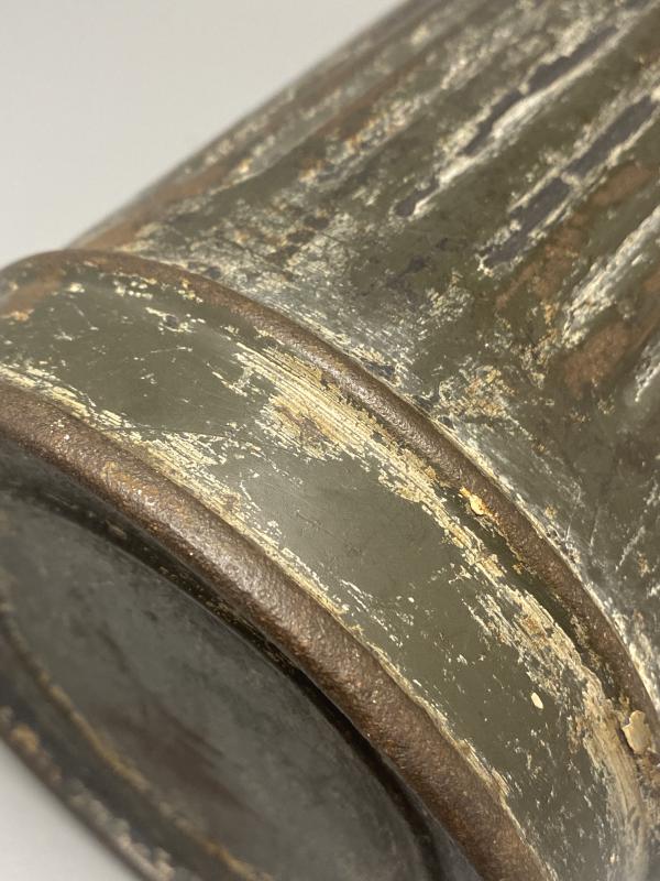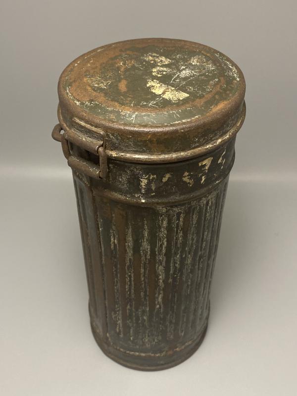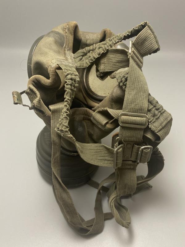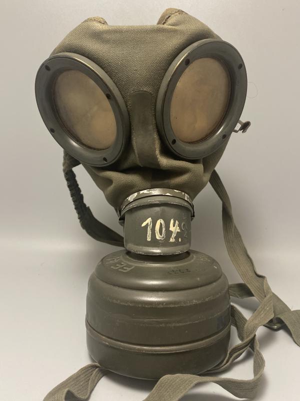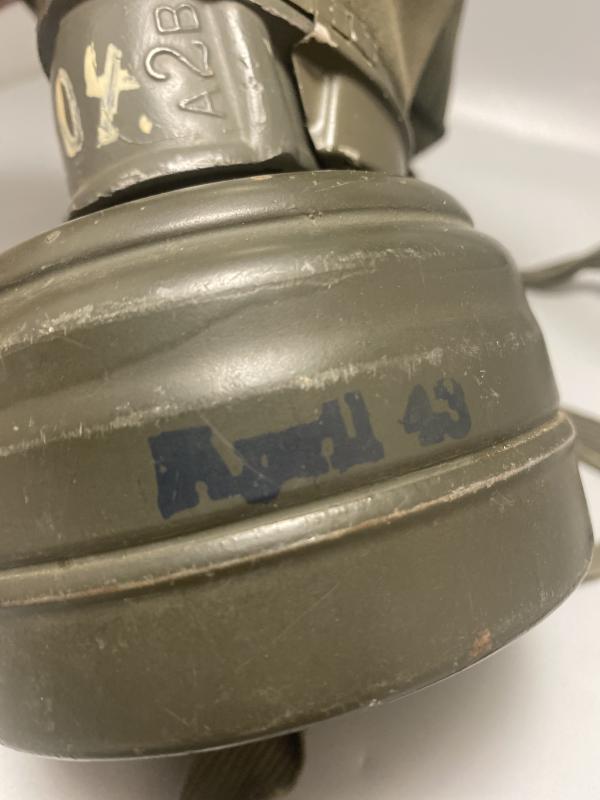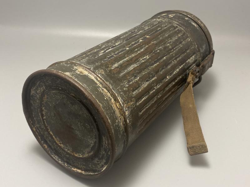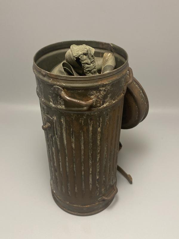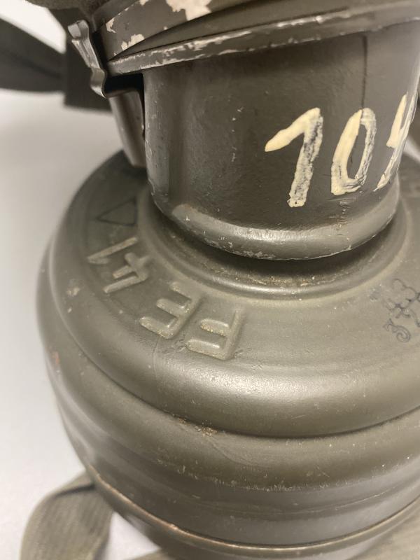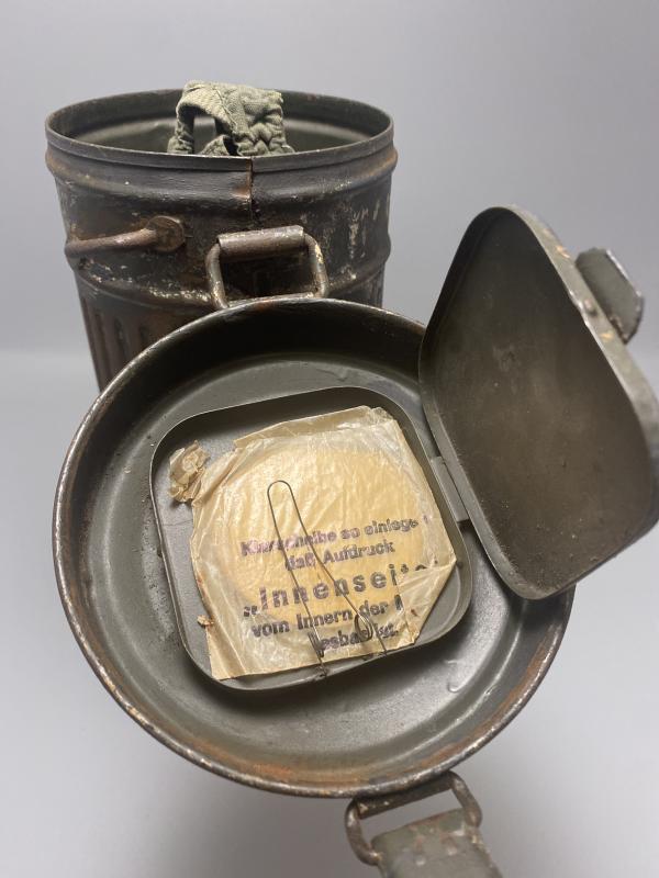 Original WW2 German army gas mask with tin. Tin has traces of original white wash paint over original factory olive green. Gas mask is in good shape with all of its original straps marked A2B fitted with a FE41 filter ( Inspection dated April 43). Tin is complete with a set of spare lenses and and the original canvas release pull. A nice example.