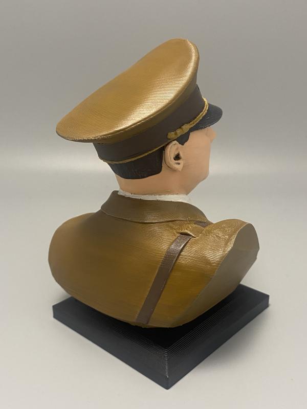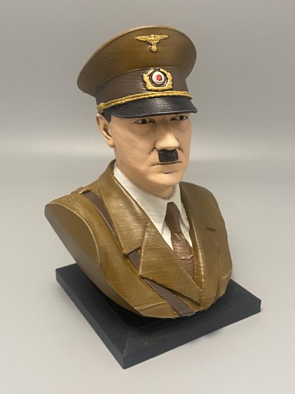 Good quality 3D printed bust of Adolf Hitler. Hand painted to a good standard. Measures approximately 14.5cm X 10cm. Base 8cm in diameter. A very nice display piece. No chips or damage. Three layers of varnish applied to protect the paint.