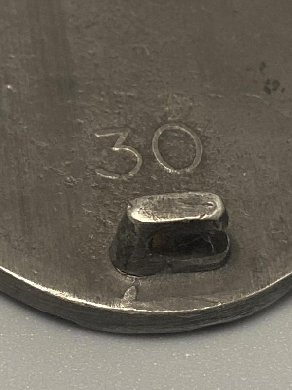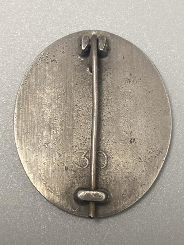 Original early silver wound badge made by maker 30 Hauptmünzamt Wein. In fairly good shape overall. A good quality made piece.