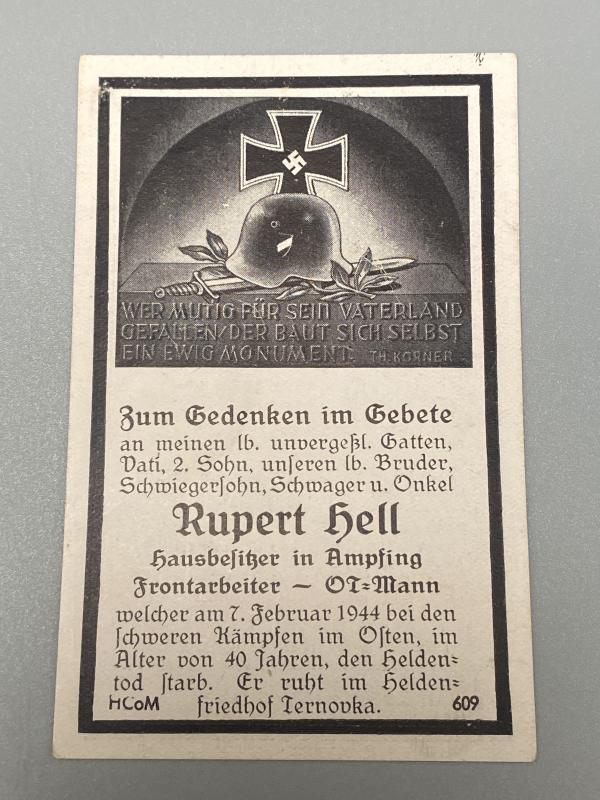 Original German death card to Organisation Todt Mann Rupert Hell. Killed in action 7th February 1944.