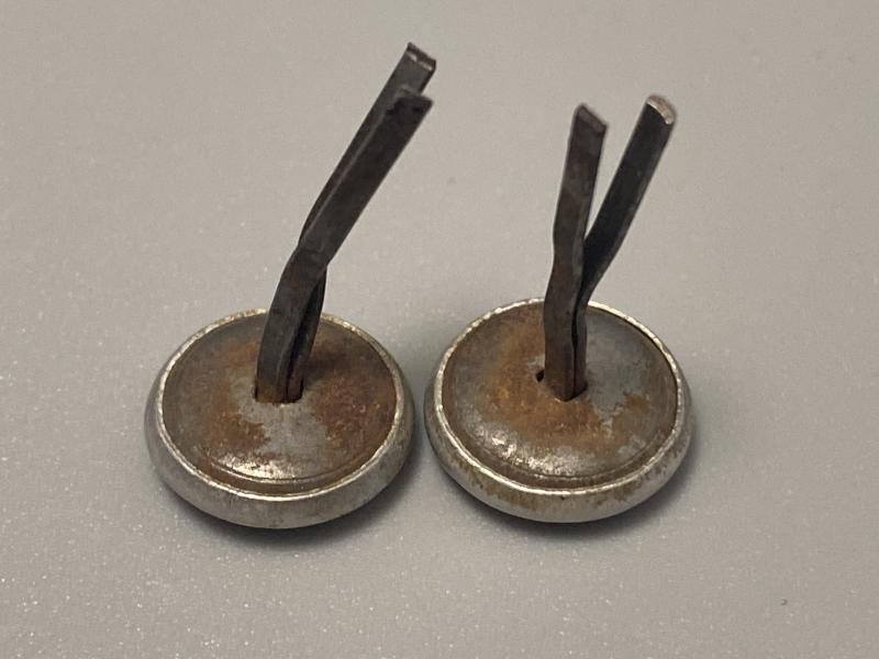 Original pair of used pin fix buttons for affixing chin straps to visors. Ideal for army and airforce caps. Correct period examples with pebbling right onto the edge. In good usable condition.