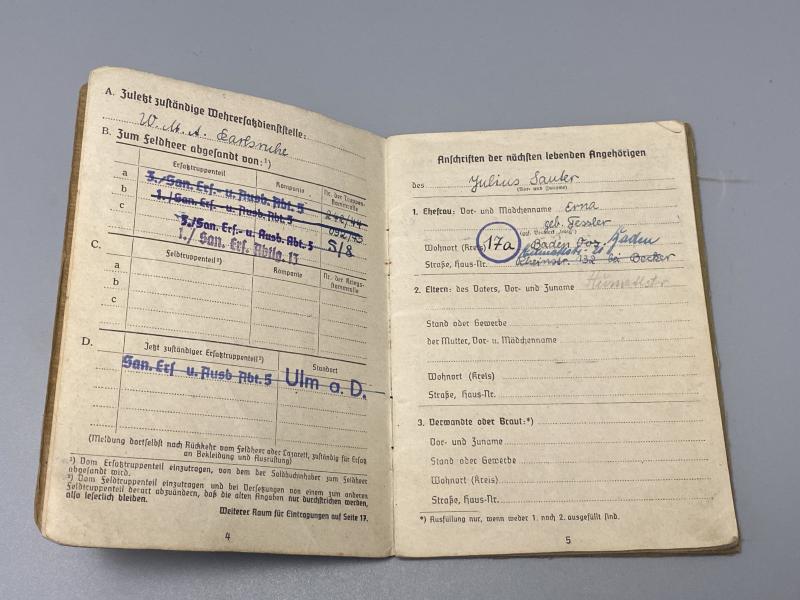 Original WW2 German army Soldbuch to Soldaten Julius Sauter of 3./San.Ers.Aus.Abt.5 (Medical Unit) joined the army 1944 and fought on the western front. Injured whilst fighting against US forces and died in a field hospital based in Würzburg 23:55hrs on 15th April 1945. Soldbuch in good overall shape. Typical red penned cross for dead soldiers.