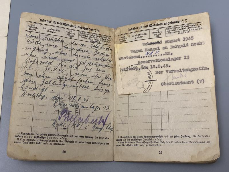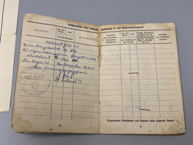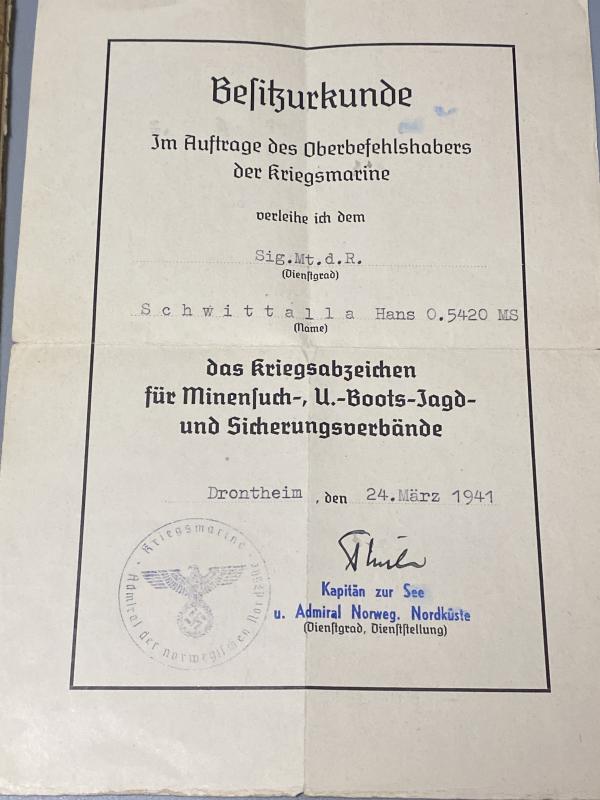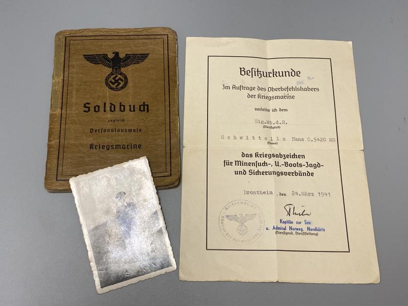 Original WW2 German Kriegsmarine Soldbuch issued to Sig.Mt. Hans Schwittalla who served on a mine laying ship throughout WW2 stationed in Norway. Noted on his awards page is the Iron Cross second class, Wound badge in black. War merit cross with swords and Kriegsabzeichen Für Minen ( otherwise known as the Minesweeper badge) his citistion for this award is included with the Soldbuch. Plenty of entries that would require more research.