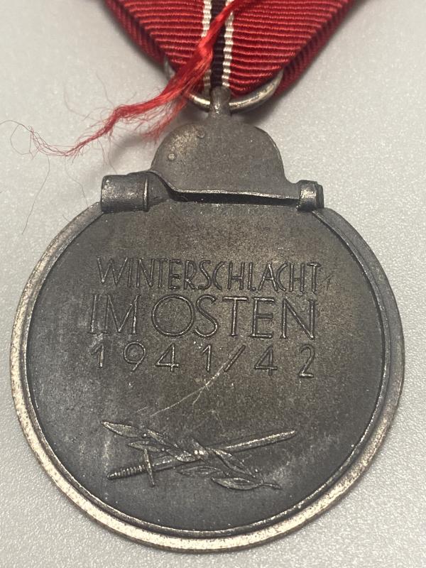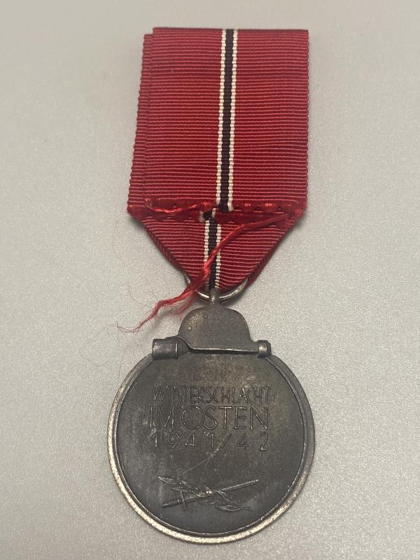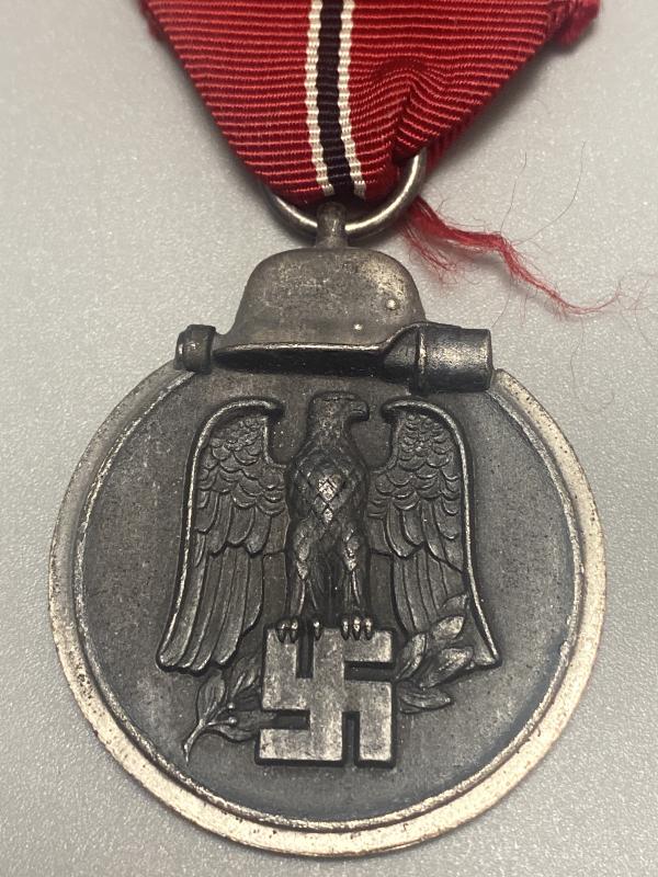 Original Eastern front campaign medal as issued to German soldiers who served on the easetern front 1941-1942. Award is unmarked on the ring, complete with ribbon. A nice honest example.
