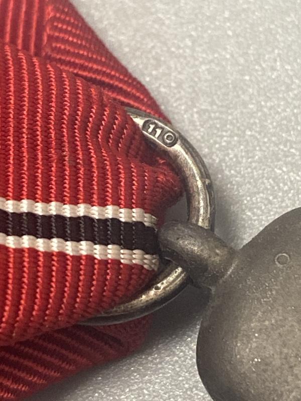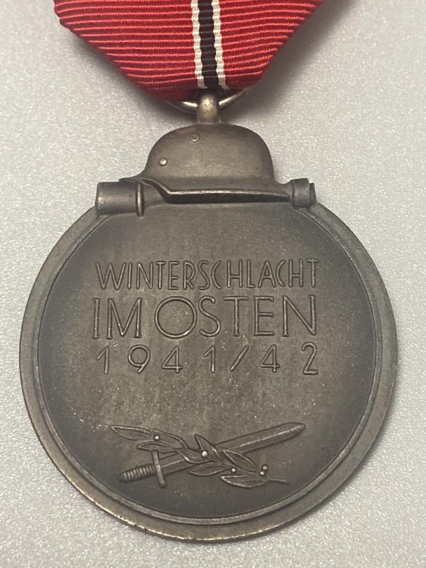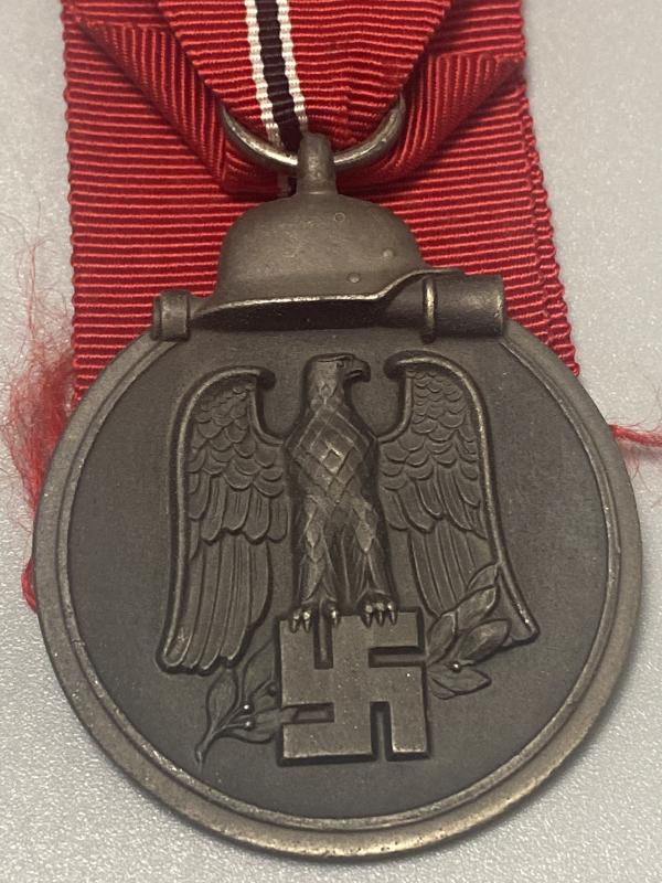 Original Eastern front campaign medal made by maker “110” attributed to the Otto Zappe factory, complete with ribbon.