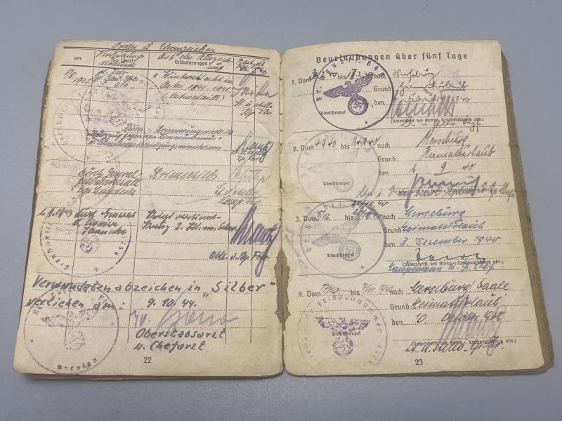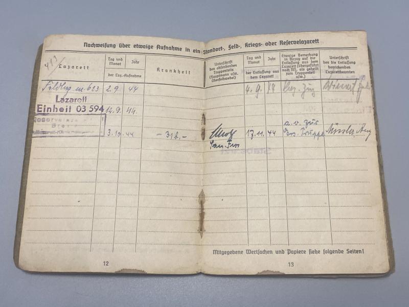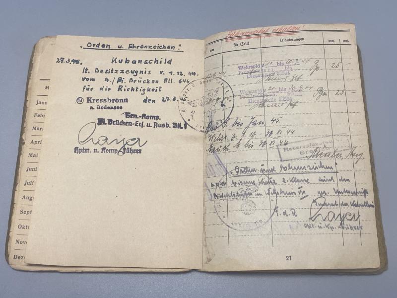 Original German Army Soldbuch issued to Stabsgefreiter Hermann Jannuschewski who serviced in the army before the war all the way to wars end. The majority of Jannuschewski’s service was based on the eastern front from the invasion of Poland to the later operation Barbarossa invading the Soviet Union. Jannuschewski was injured by Artillery fire in October 1944, he was well decorated with entries for the Iron cross second class, Krim Shield, Kuban shield, eastern front campaign medal, wound badge in black & silver and the Romanian issued Crusade on communism award. The Soldbuch is bloodstained on the front cover, we can assume it was during one of his several injuries that this staining came about. Towards the end of the Soldbuch, a few of the earlier pages have been reattached in the incorrect order however all the correct pages are present with none missing. Jannuschewski’s unit was directly involved in heavy combat in April 1944. An extract below relates to the bravery of the units commanding officer Major Streit, for this, he was recommended for the knights cross decoration. It gives a detailed observation of the combat Jannuschewski encountered.