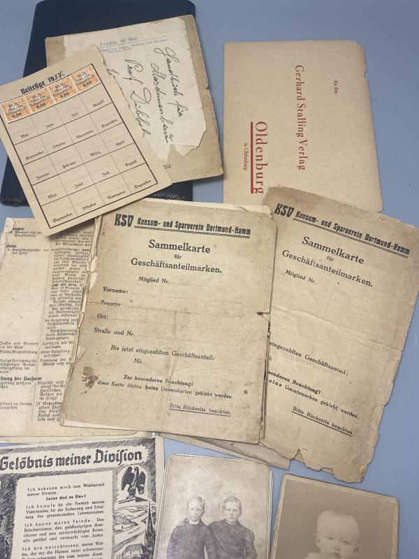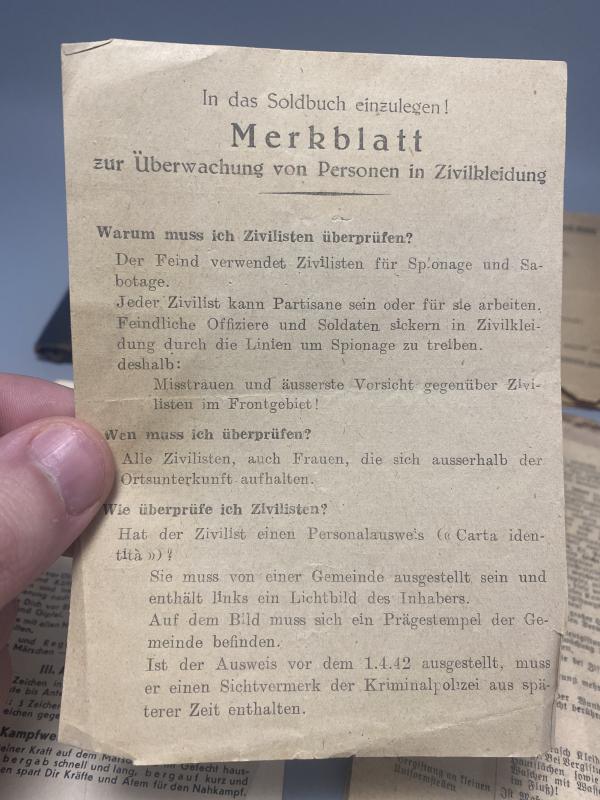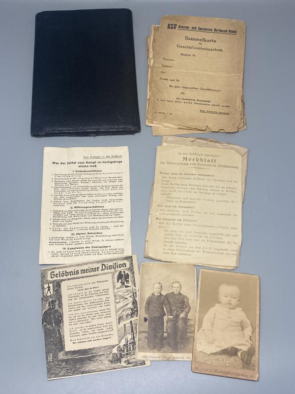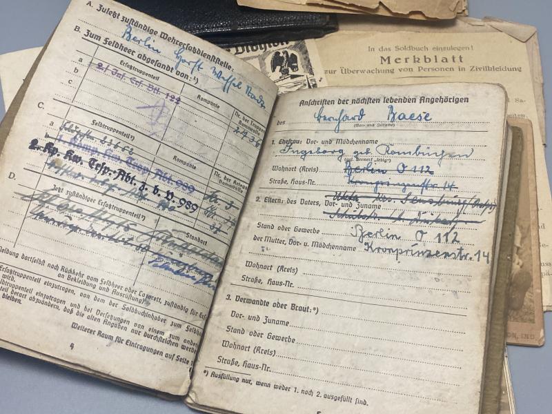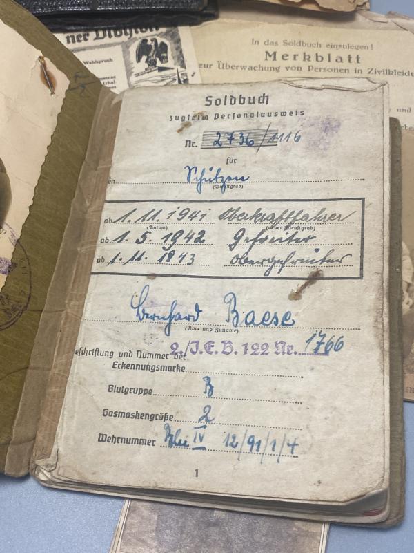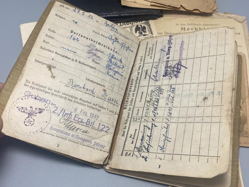 Original German army Soldbuch issued to Obergefreiter Bernhard Baese who served as an infantryman attached to Infantry Ersatz Battalion 122. His service took him across Romania, southern Russia, Sevastopol and finally south west Italy. Included with his Soldbuch is his leather wallet with many other documents including a sheet with his divisional motto, a leaflet for soldiers explaining how to deal with suspicious civilians and other bits including pictures and ration documents. A nice wholesome piece.