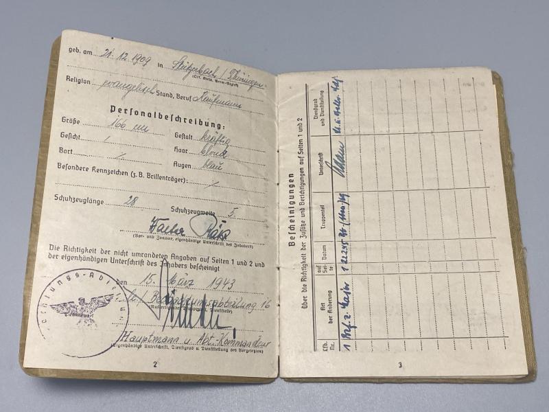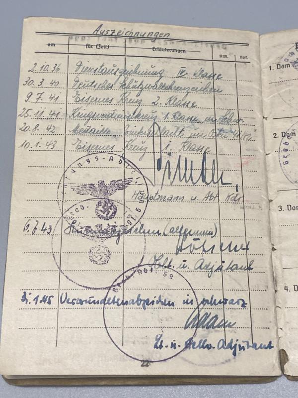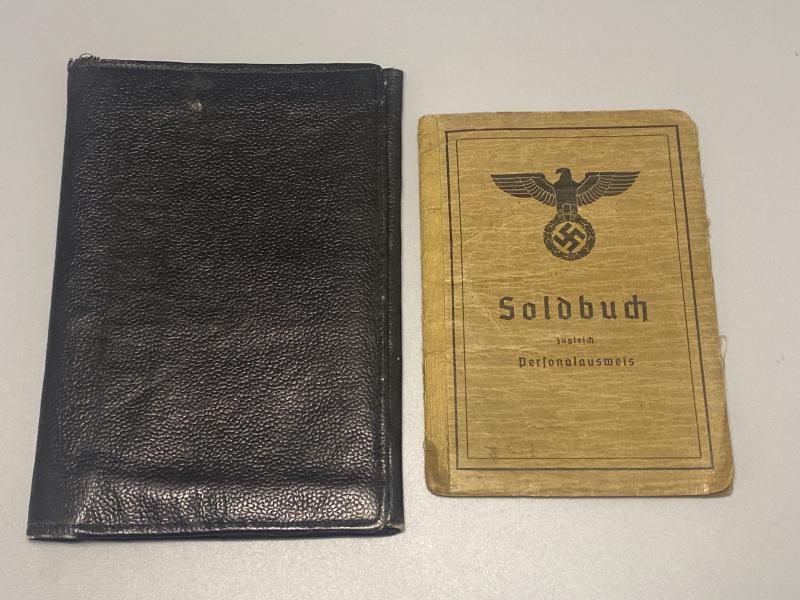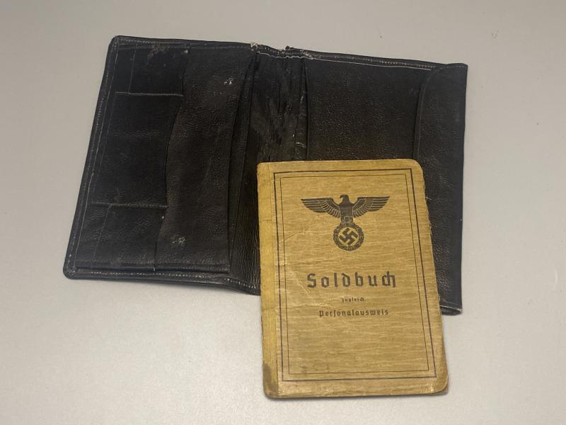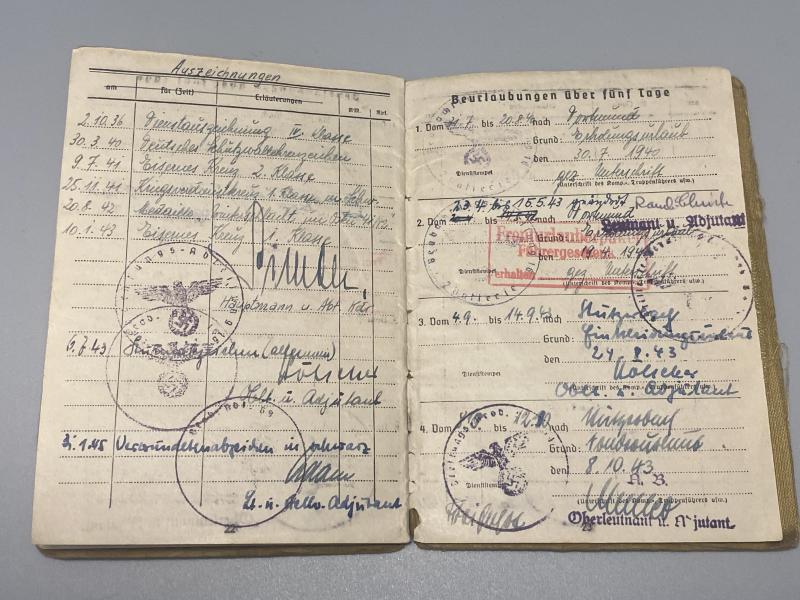 Original German army artillery officer Soldbuch issued to Major Walter Bätz of Beobachtungsabteilung.16 which was an Artillery observation unit. Bätz served in Southern Russia throughout the entire war. He later joined Beob.Abt.69. Bätz was well decorated during the war including the German army Long service medal, Westwall medal, Iron Cross second class, Merit cross with swords Second and First class, Eastern front medal, Iron cross first class, Assault badge and wound badge in black. Certainly plenty of research can be done here. A nice Soldbuch, very difficult to obtain reasonably high officers ones. Soldbuch is a second issue, complete with a leather wallet that he would have carried the book in for protection.