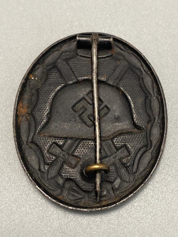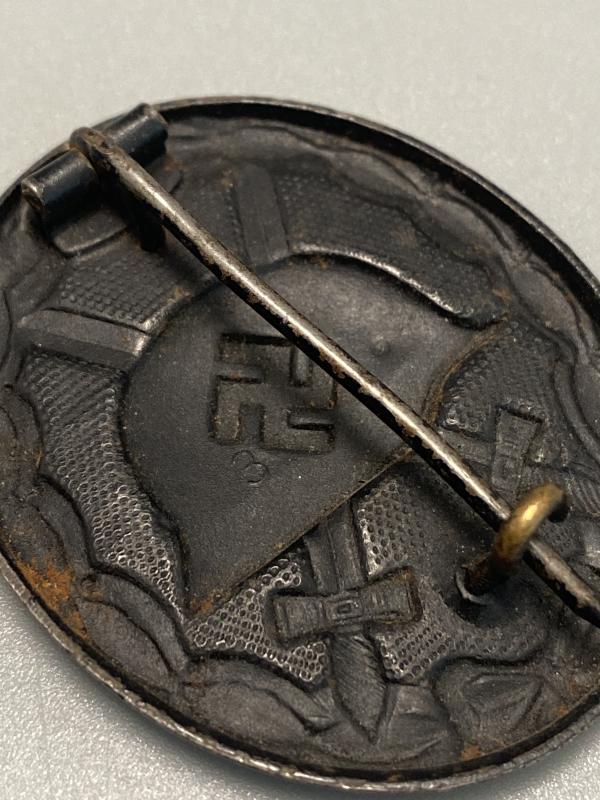 Original maker marked black wound badge for the Wilhelm Deumer factory, complete with original pin, hinge and hook hardware.