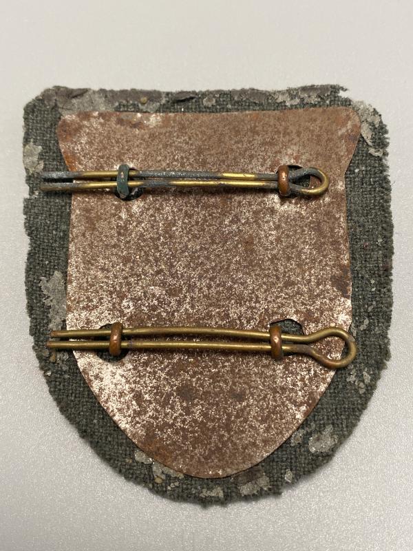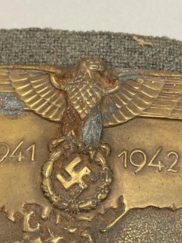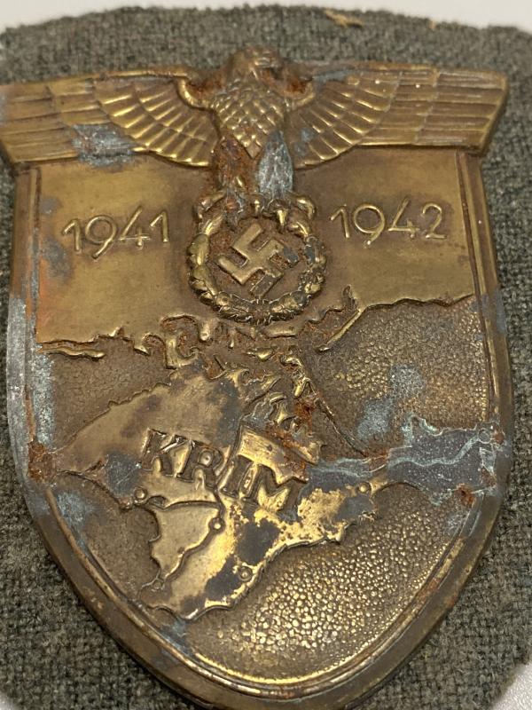 Original German Krim Shield with original metal plate backing and wool. Pins repaired at some point and lugs fitted. Wool on the underside of the badge still retains its wool nap. Some staining on the shield front.