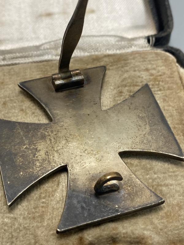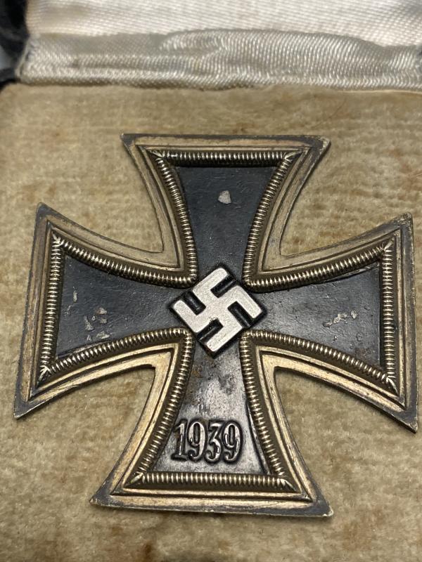 Original unmarked Iron cross first class complete in original box. Award shows signs of heavy use with west on the high parts of the award. No makers mark present on the badge.