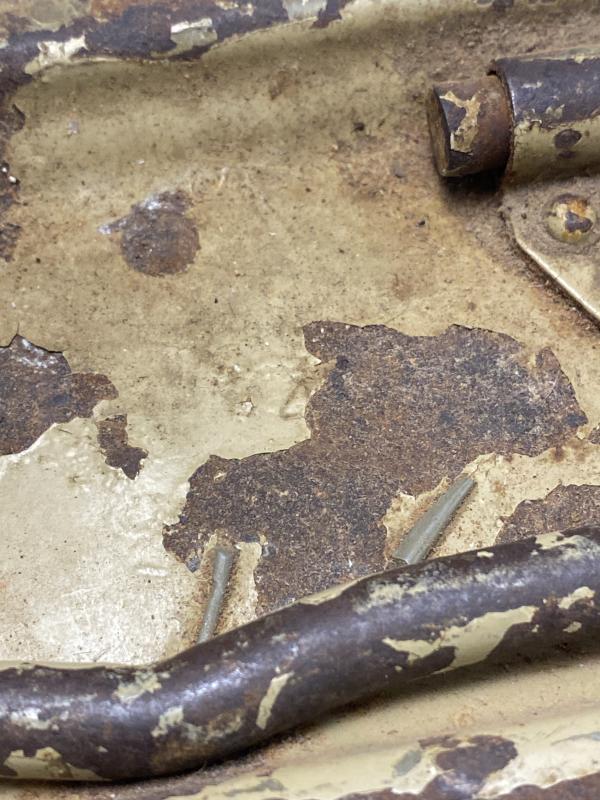 Original German army ordnance tan painted MG34/42 ammunition tin. Faint “4” mark on the top of the tin. Likely brh/4 or a date 43/44. In good overall condition. 80% + original paint remaining on the can.