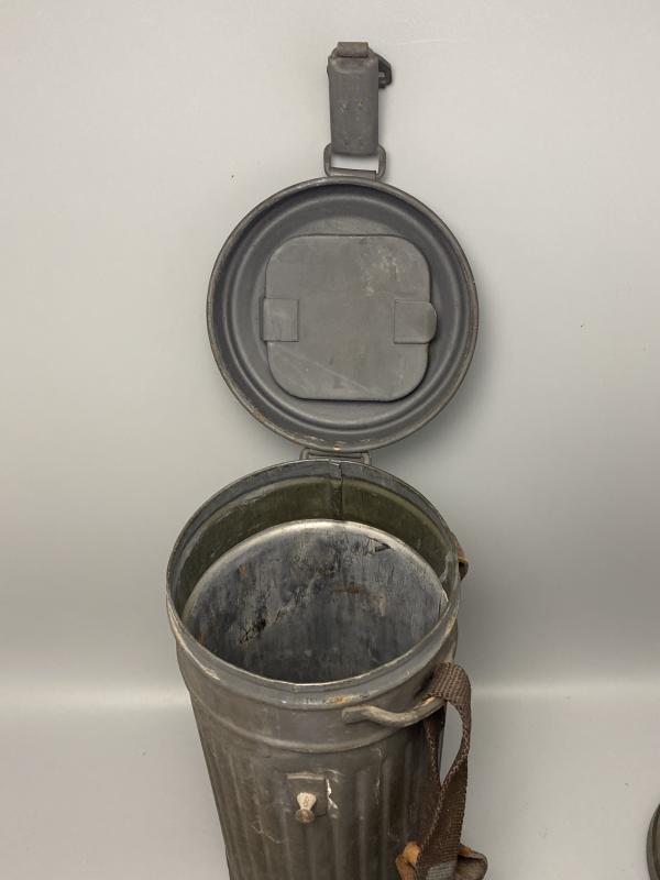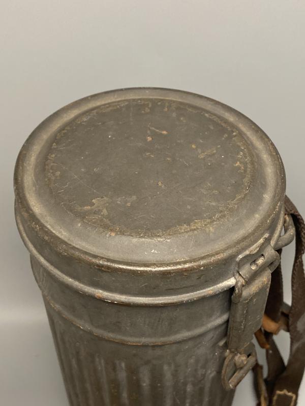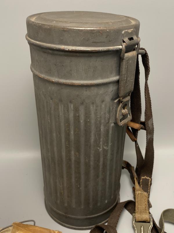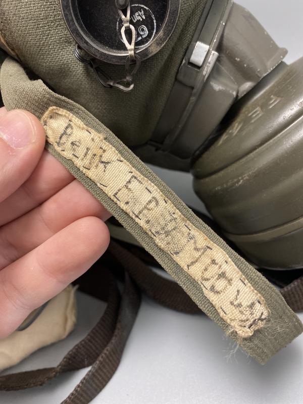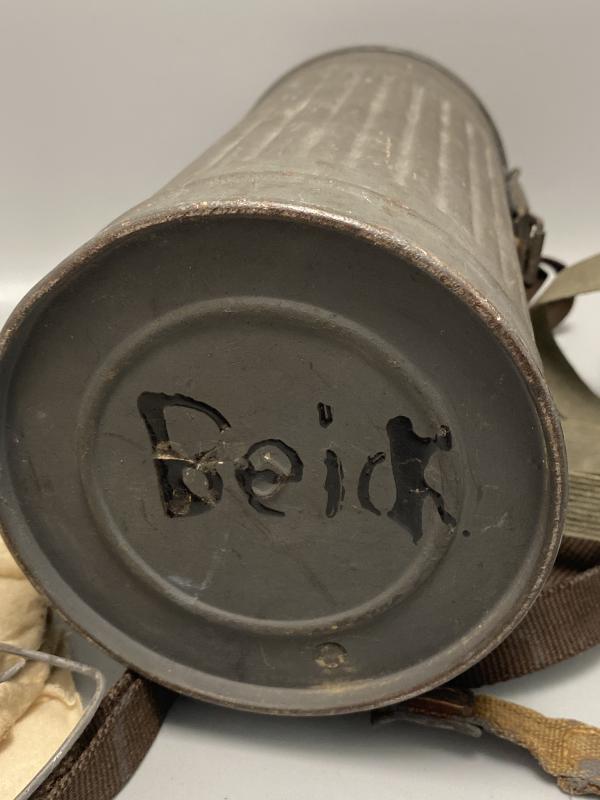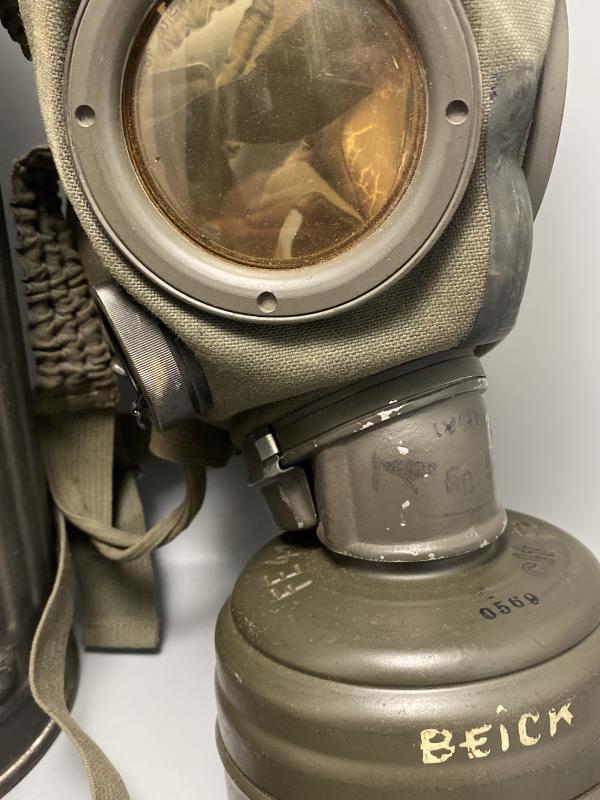 Original German Navy gas mask with outlet for communications equipment. Mask, filter and tin all named to “Beick”. 1937 dated mask with 42 lenses. Right cheek fitted with the outlet which can be unscrewed to fit radio equipment. FE41 filter present. One of the straps has Beicks Feldpost number present. Clearly beginning M for marine. Tin is in period “ship grey” paint with spare lenses (lense compartment marked M for marine with marine eagle) cleaning cloth, metal can spring and straps present. Whilst straps are present, the leather has snapped and the belt hook is broken. Despite this a difficult to obtain mask, which has been together since the war without any alterations.