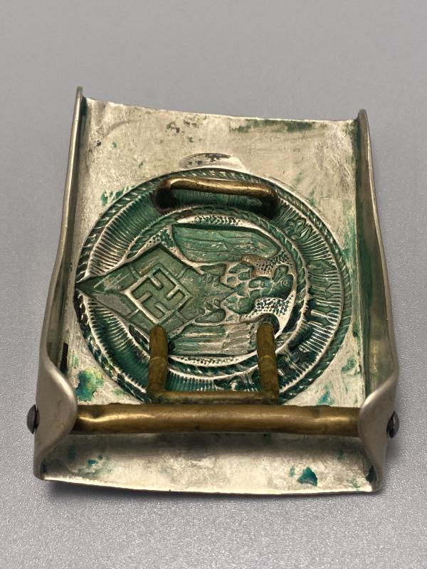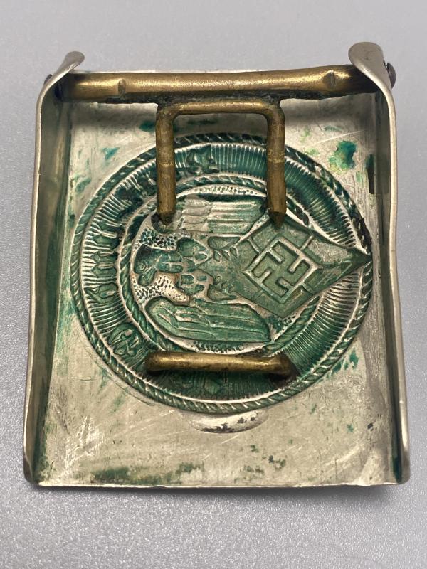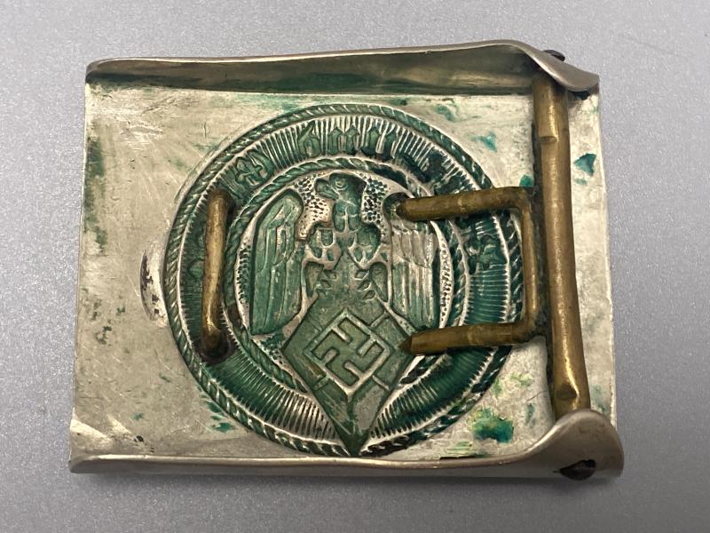 Original early HJ belt buckle. Unmarked example. Well worn, one hard dent on the area central to the eagle.