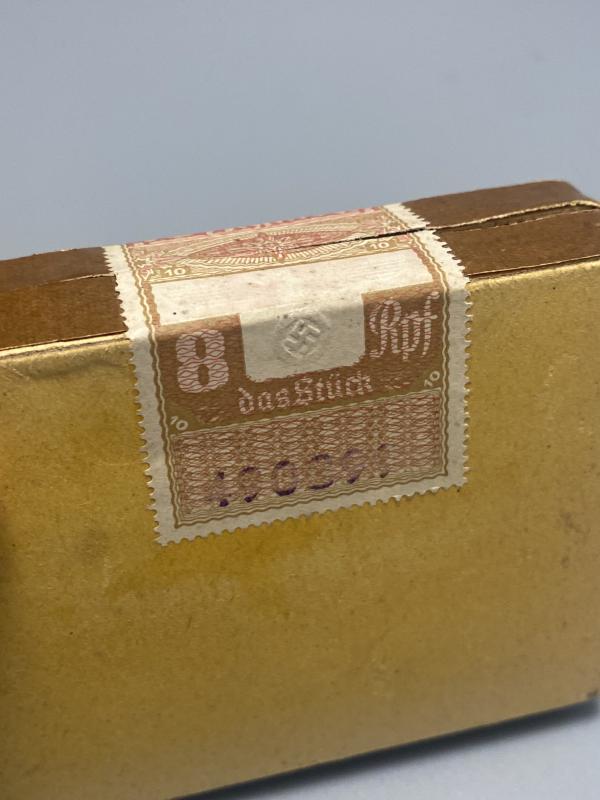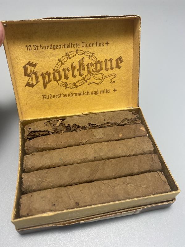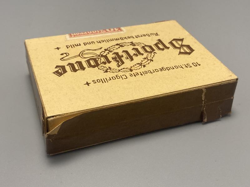 Original box of third Reich period cigarillos made by sportkrone. Unused contents with original third Reich tax seal.