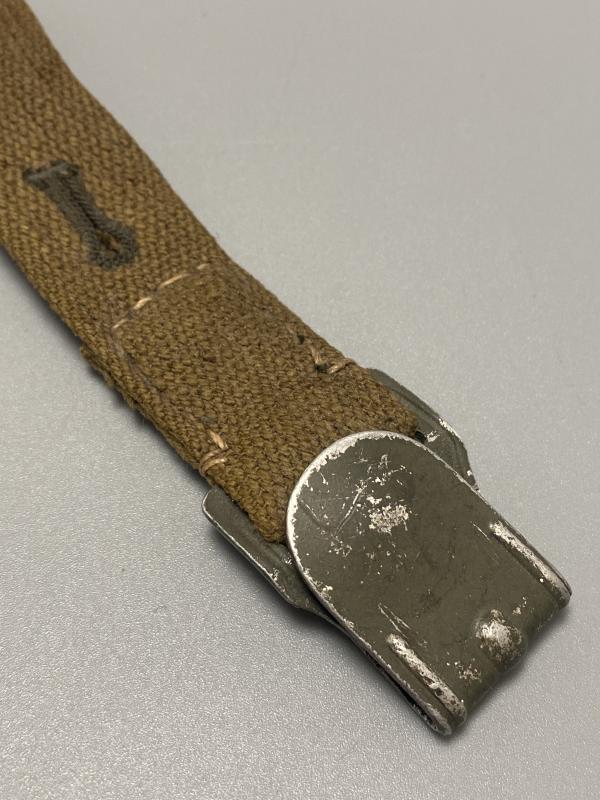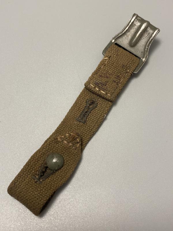 Original German army gas mask tin belt strap with accompanying hook. Attaches to the lower part of the gas mask tin and then hooked into the belt. A nice original piece.