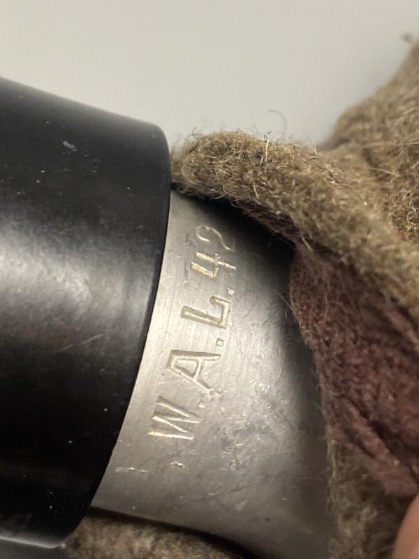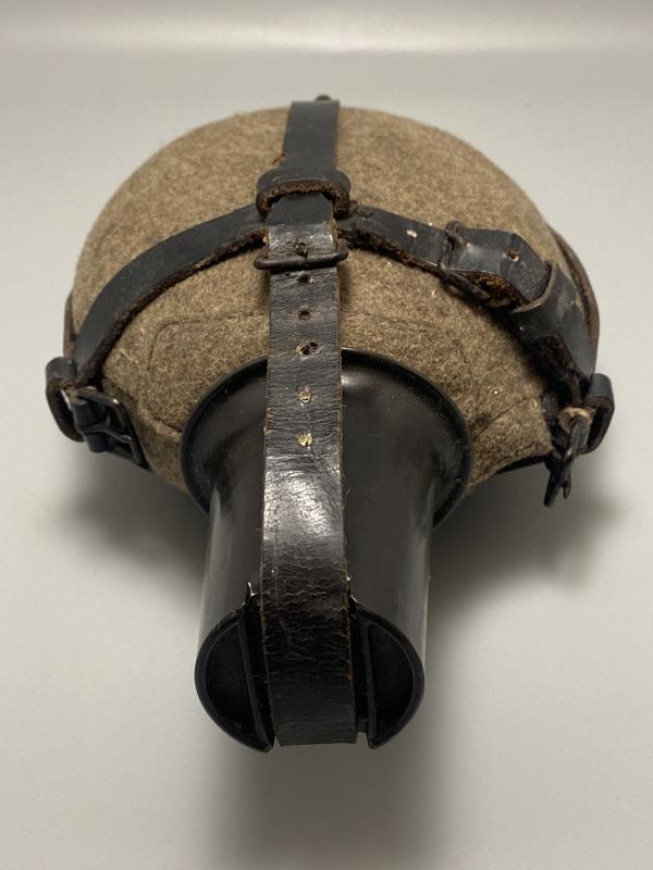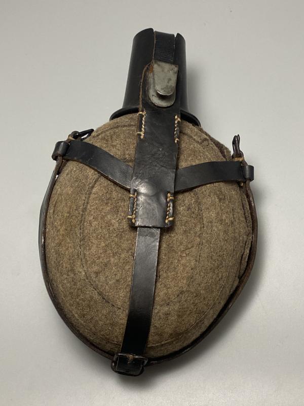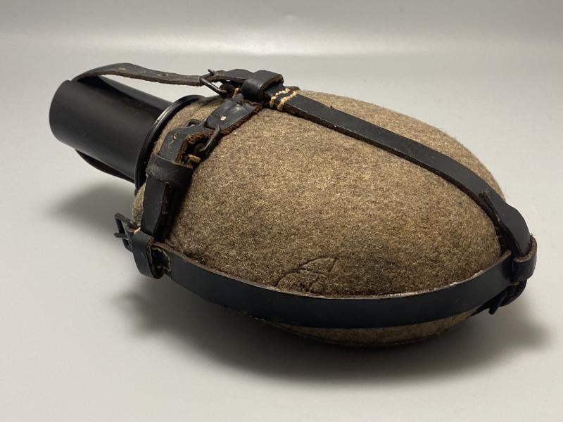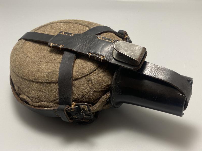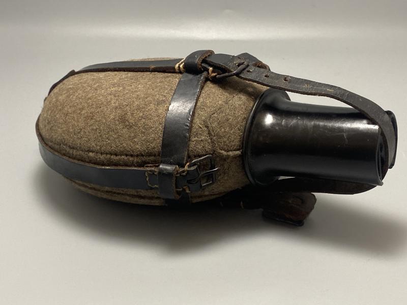 Original German army medical water canteen with Bakerlite cup. Bottle marked WAL42 and cup dated 1944. Nice condition leather and felt cover to the bottle. A nice wartime example.