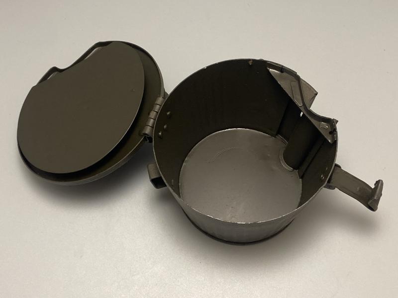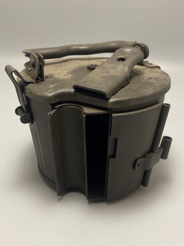 Original later war German MG34/42 basket drum painted in a dark green finish. Drum appears unissued. A thick layer of dust is present over the top of the basket. Marking on the top of the drum is ddf. A nice clean example.