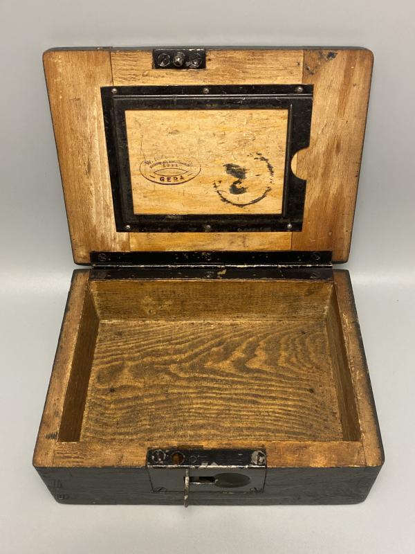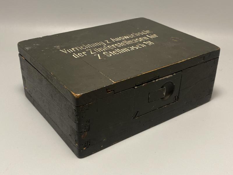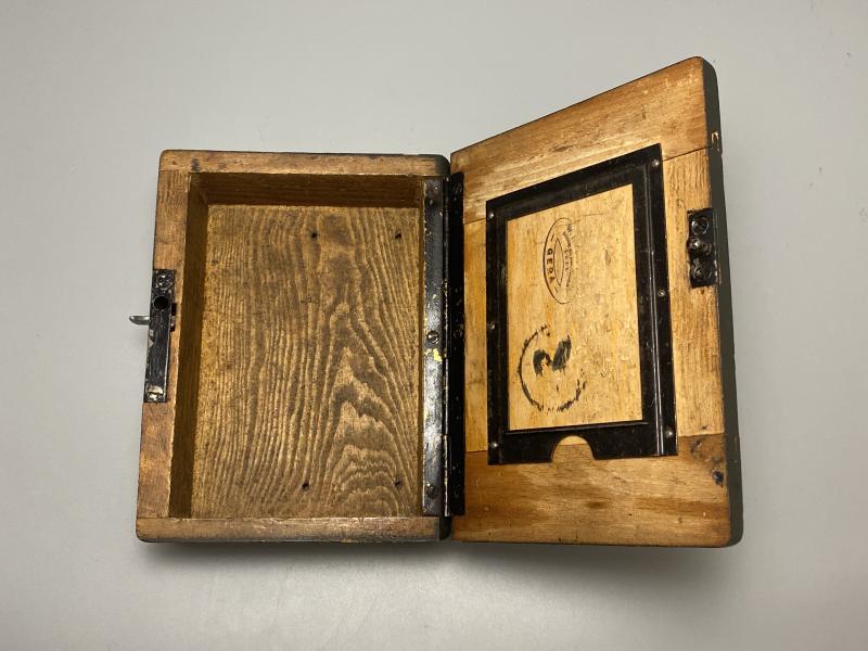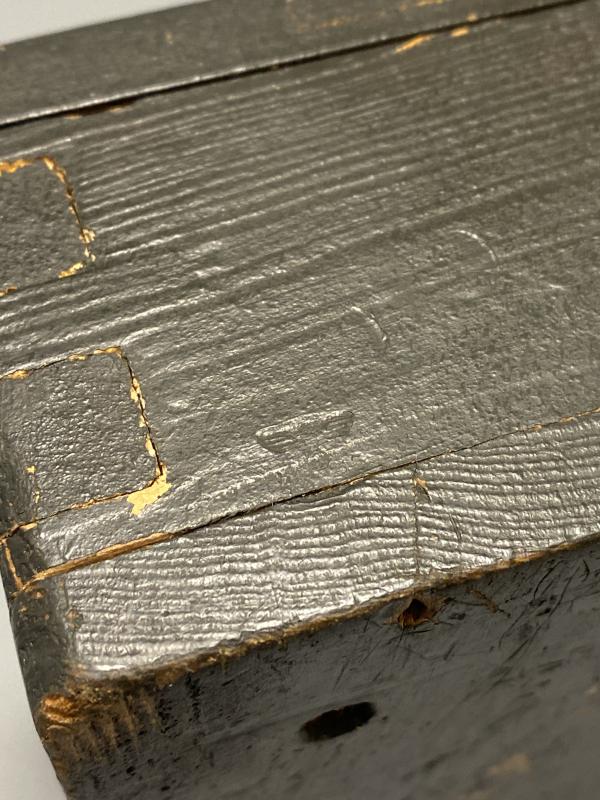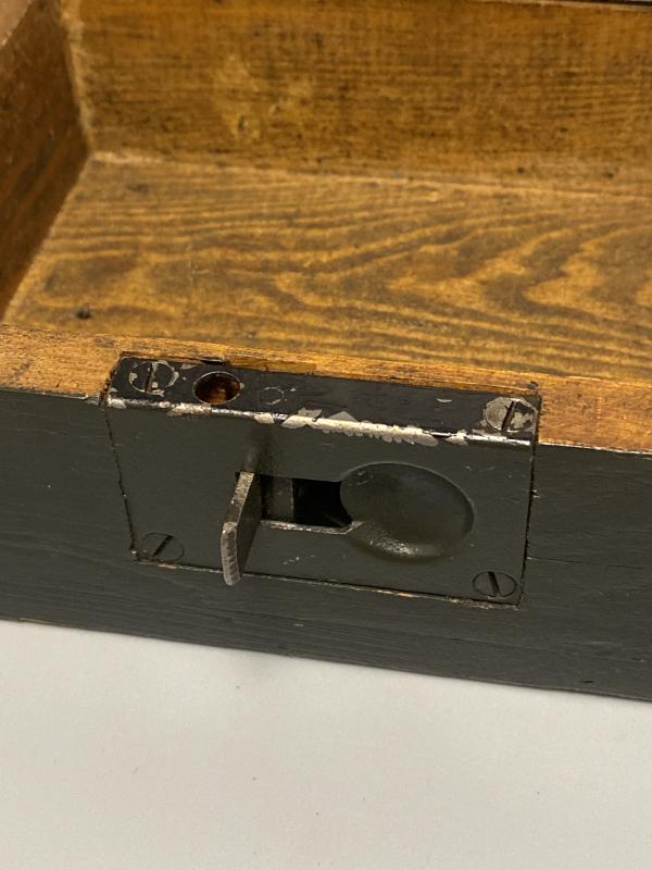Nice original wooden tool box for detonator alterations. Complete in original green paint with stencil on the front. Only a small box roughly 18cm X14cm X 7cm deep. Single flip lock on the front of the box. WaA inspection mark present on the side of the box.
