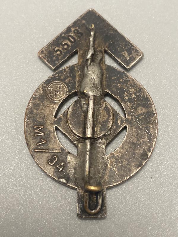 Original Hitler Youth bronze proficiency badge maker marked RZM M1/34 Karl Wurster. Numbered 55037 on the reverse. Unfortunately the pin is missing on the back.