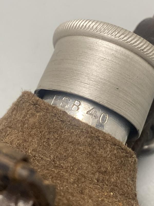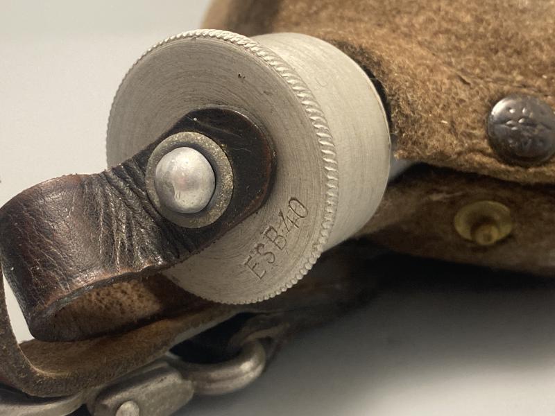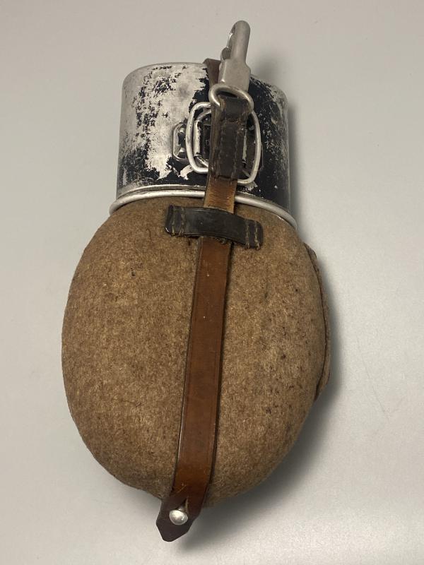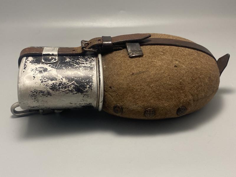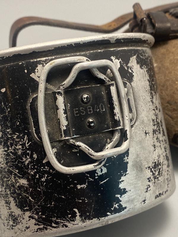 Original German army water canteen, fully matching aluminium cup, cap and bottle all marked ESB40. Bottle in used condition, nice soft leather. Some very small minor moth nip to the felt cover.