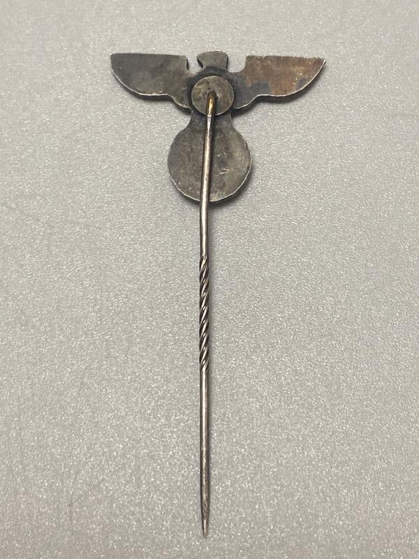 Original German third Reich period stick pin or tie pin featuring the German Eagle with oak leaf wreathed swastika. Twisted pin type.