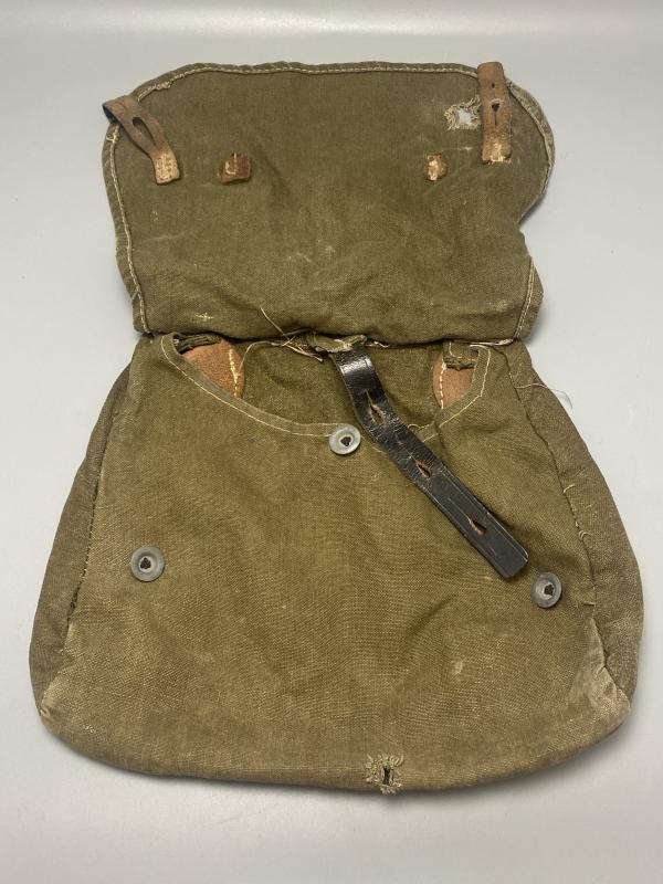 Original German army M31 bread bag made of canvas with leather fittings and steel hardware. Overall nice clean condition, one hole present in the front flap roughly an inch in diameters a small hole in the bottom of the bag also present. Period dish buttons present, leather remains soft.
