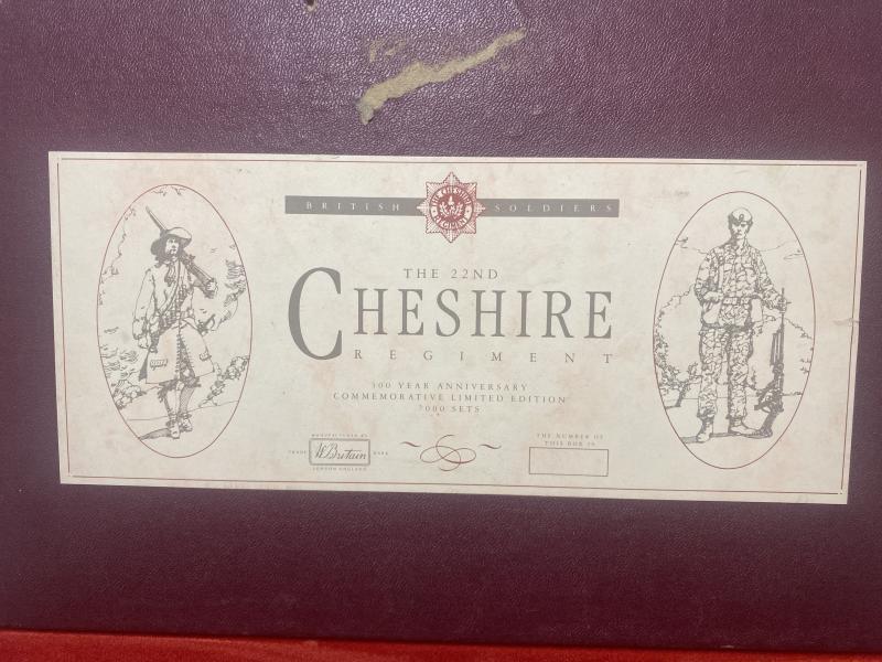 The 22nd Cheshire Regiment 300 year anniversary commemorative limited edition set of toy soldiers made by William Britians. All ten figures in perfect condition and never removed from the box. Complete with red velvet display, foam protector and box. Set limited to 7000 sets.