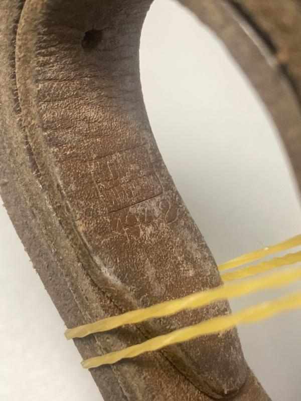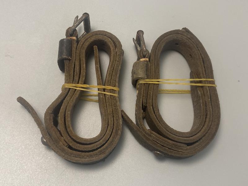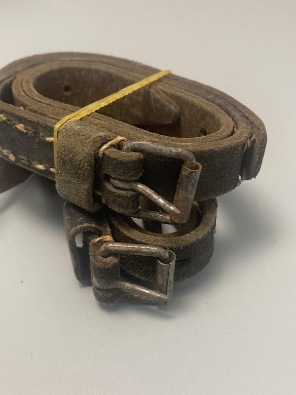 Pair of original German leather Zeltbahn equipment straps both maker marked and attributed to a factory in Bielefeld, dated 1942.