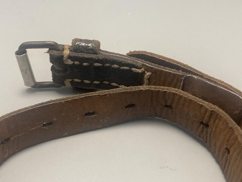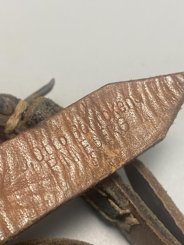 Original German black leather zeltbahn strap maker marked to a factory based at Pinneberg. Strap is dated 1942. In good used condition.