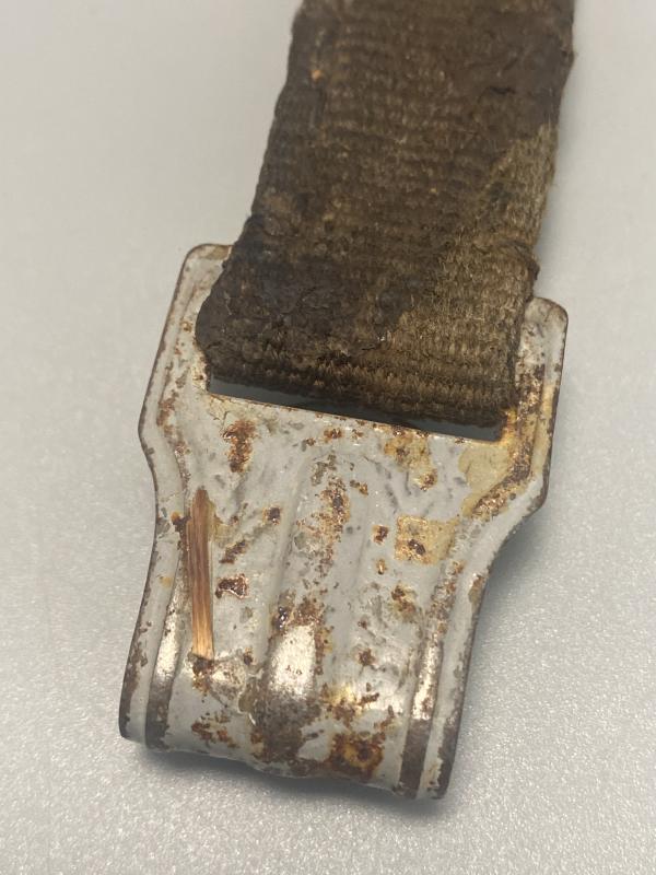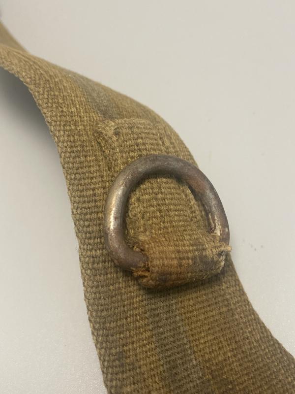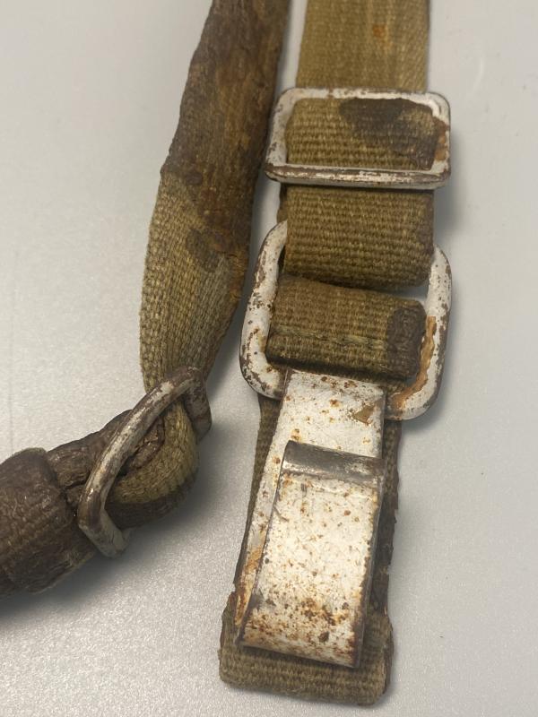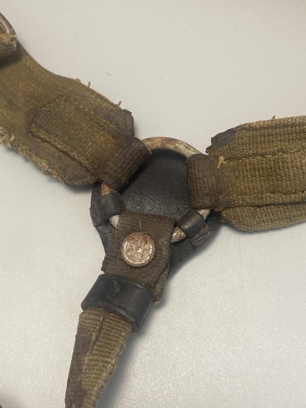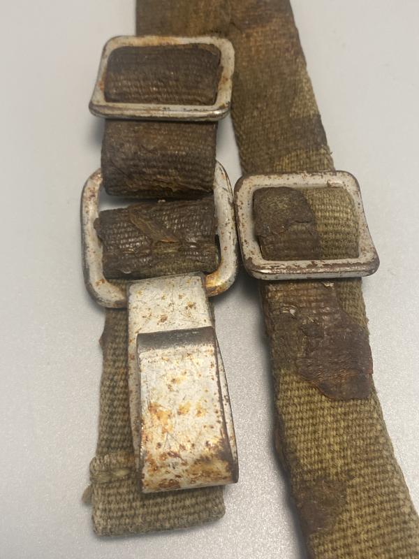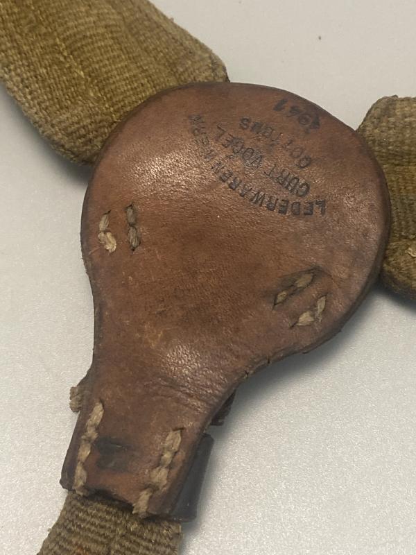 Original very early DAK tropical canvas Y Straps made by Lederwarenwerk Curt Vogel, Cottbus 1941. A very good example of the early type in greenish canvas. Grey painted hardware marked JDEHA. Some staining present with an oil which has solidified in areas. This could possibly be removed however we have left them as found. The straps remain fully flexible and attach well to equipment. No damage is present, a hard to find early pair of straps! Maker mark and year stamped into the rear leather section.