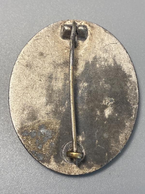 Original Silver wound badge maker marked 100 for Rudolf Wachter & Lange. Good amount of wash finish remaining. Maker marked present on the upper part of the hook.