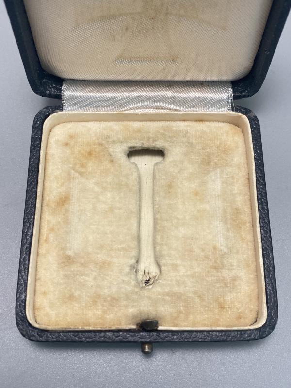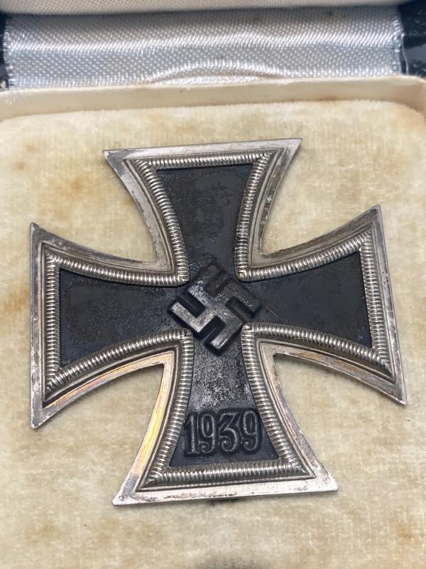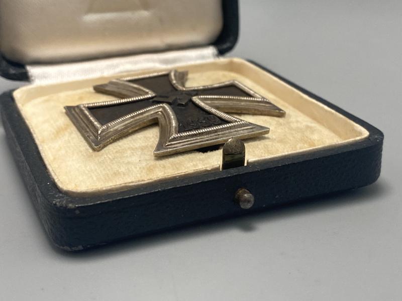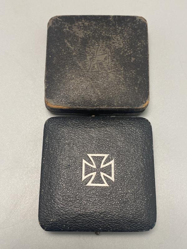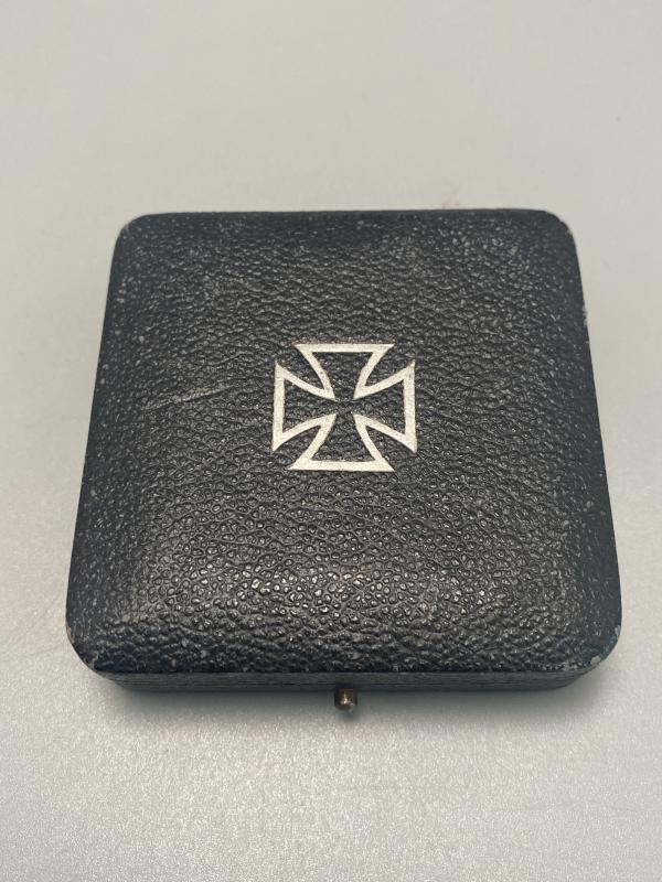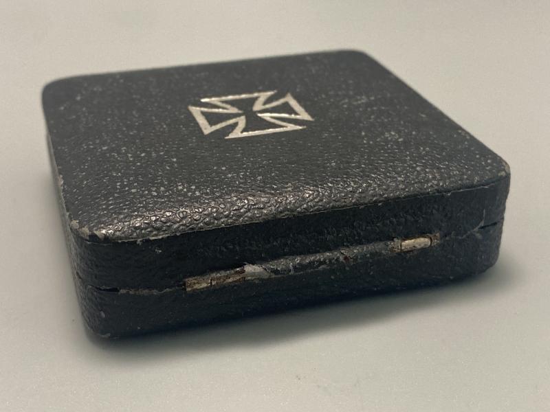 Original Iron cross first class slightly vaulted example manufactured by Klein & Quenzer. Cross shows signs of wear however remains in good clean condition with correct factory applied hinge, hook and pin on the reverse. Box is otherwise known as the “Green box” with its almost black appearance with green tinge to the finish. A really nice field worn example. Last photo shows the box compared to a standard EK box variant.
