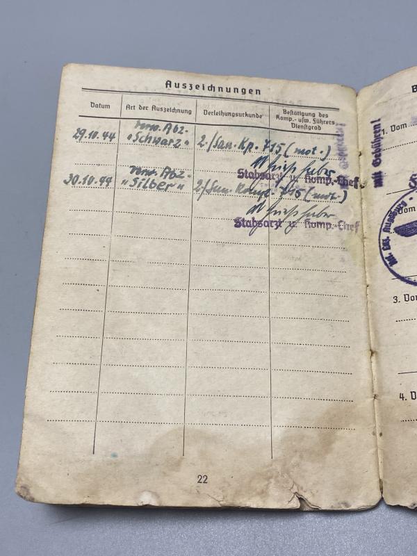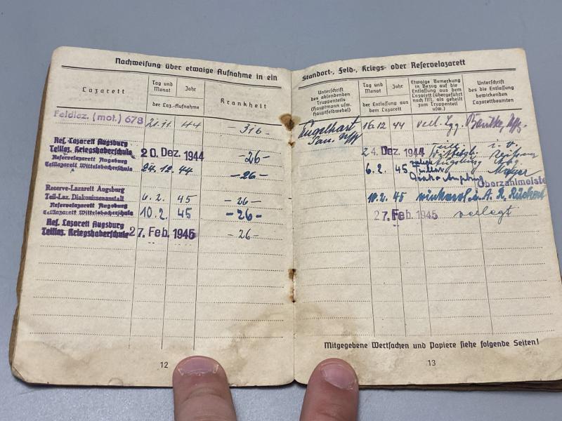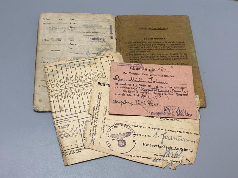 Original German army Soldbuch issued to Grenadier Johann Müller of Grenadier Ersatz Batalion 134 and later Lds.Schtz.Ers.Btl.17. Müller enlisted on the 29th March 1944 at 18 years old where he was initially placed in a grenadier battalion he served on the Eastern front first in the Czechslovak republic and later Austria in 1945. Müller was hospitalised after serious shrapnel injuries from either grenades or artillery on the 21st November 1944. He remained in hospital until discharged on the 16th December 1944. Four days after his discharge he was reported back to hospital, this time for a much longer period. Unfortunately Müller had serious combat PTSD. Notes on his Soldbuch at the time shows the hospital attempting to discharge him three times despite his mental state. From the 20th December 1944 until at least 27th February 1945 Müller was in hospital for psychiatric reasons. He was awarded the wound badge in Black and Silver for his injuries. Included with his pay book is a hospital travel pass, a hospital evening travel pass and a dental document. This book evidently displays the sad state of affairs for a young man in the war, a teenager experiencing PTSD, something at the time which was seen more as cowardice rather than a mental condition.
