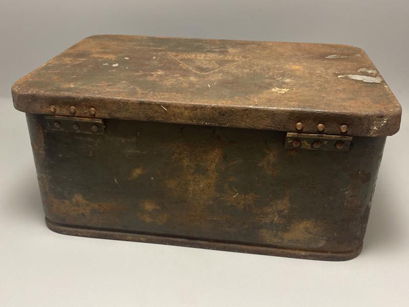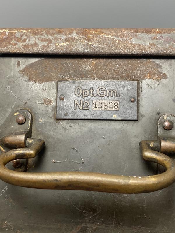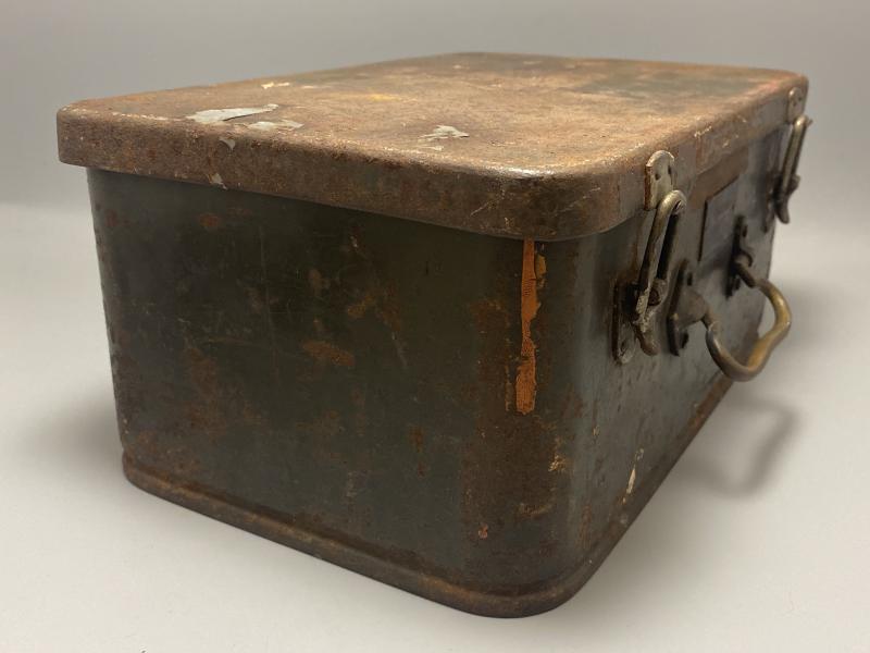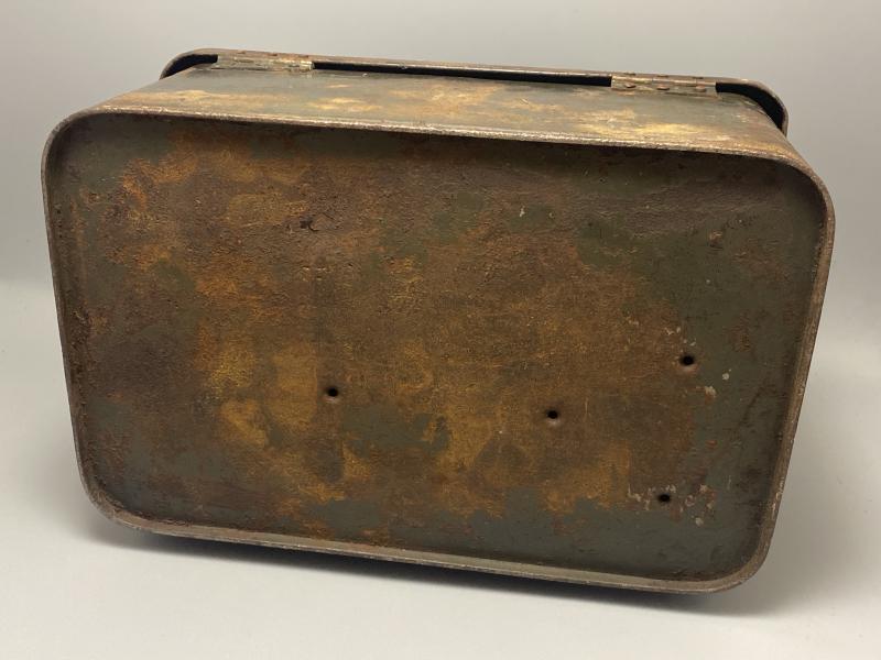 Original empty tin for the WW2 German navy optical gas mask. Tin in fairly good condition for age with a lot of remaining green factory paint. Internal dividers removed from the tin. Some surface rust to the top of the tin due to storage. Overall a really solid original tin.