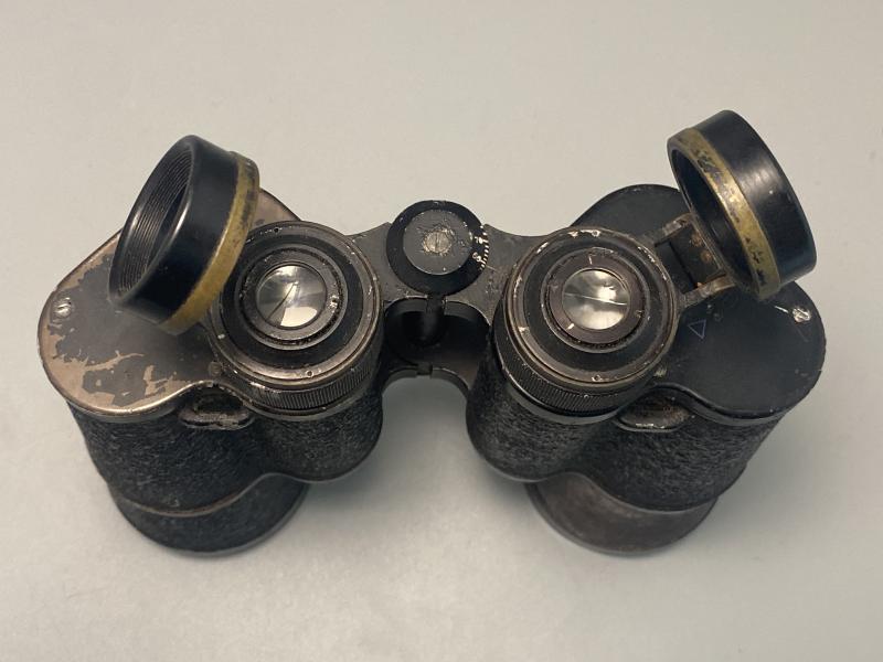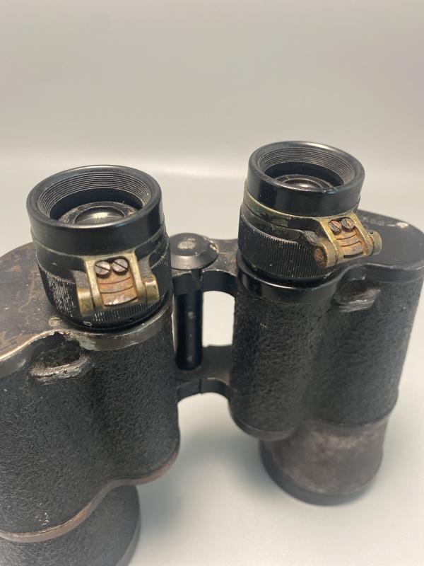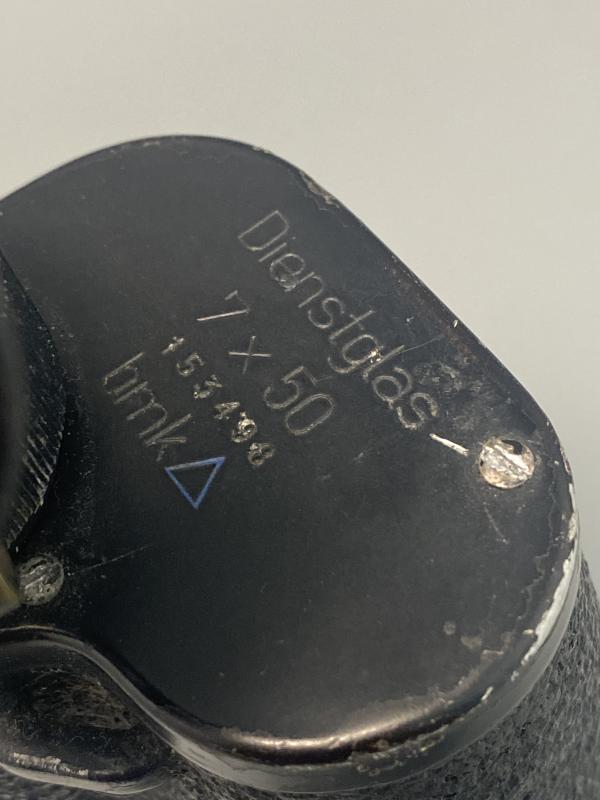 Original pair of bmk marked German army field binoculars in 7X50 complete with caps to change filtered lenses. Right side lense has the correct rectical for ranging. Binoculars overall in good shape. One small crack in the left lense however it is not noticeable when looking down the lense. Some minor loss of the false texture. Please view photos for this. Overall a nice uncommon set of binoculars.