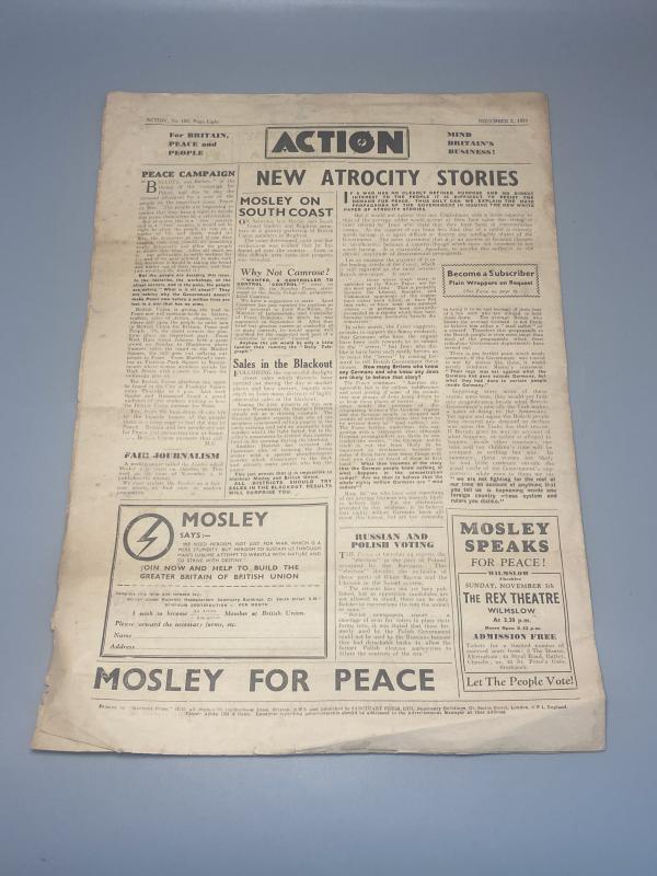 Original Action Newpaper as published by the British Union of Fascists. Printed November 2nd 1939 issue number 192. Paper is a little tatty around the edges however no rips and is complete with all pages. Eight pages in total.