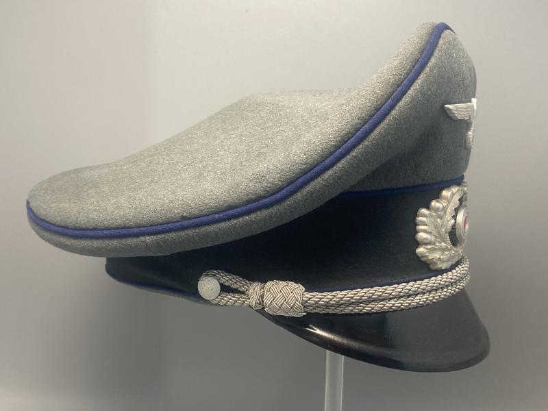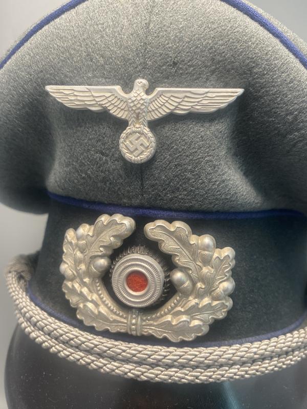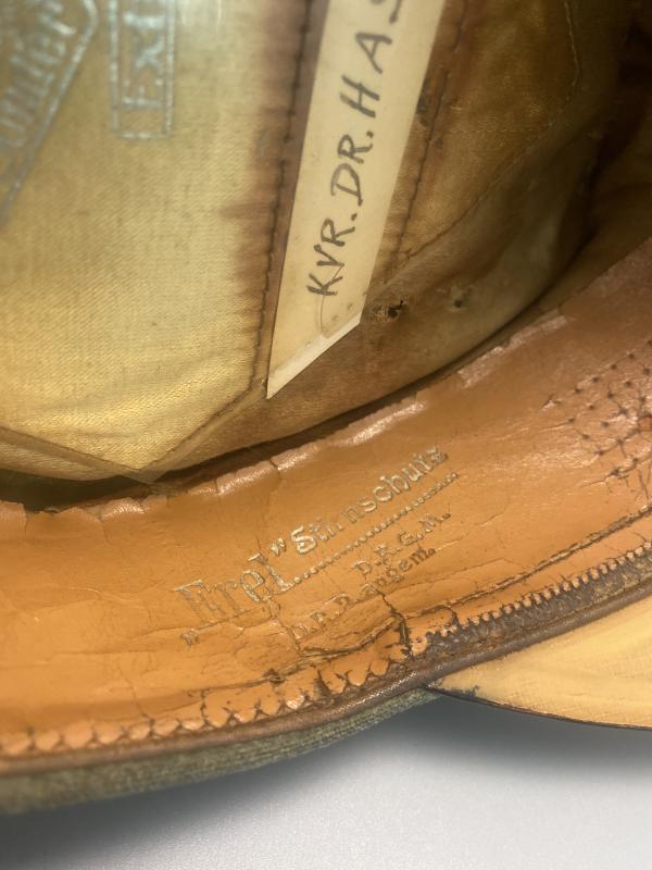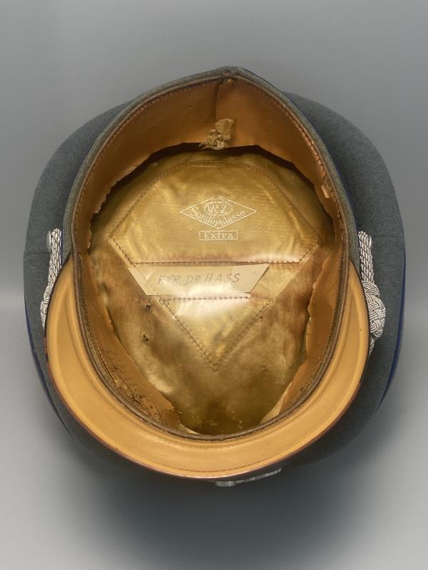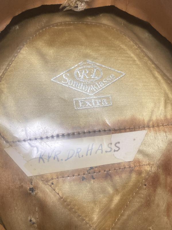Original Erel made Medical officers visor cap, named inside to a “Dr. Hass”. Cap is made of a fine stone grey wool with aluminium army insignia. Complete with wire braid chinstrap and silvered pebble buttons. No moth nips going through the wool. Externally very good. Inside heavy sweat marks present on the sweat band and on the internal liner. Erel stamp present on the sweat band and in the top of the cap. A very nice piece overall.