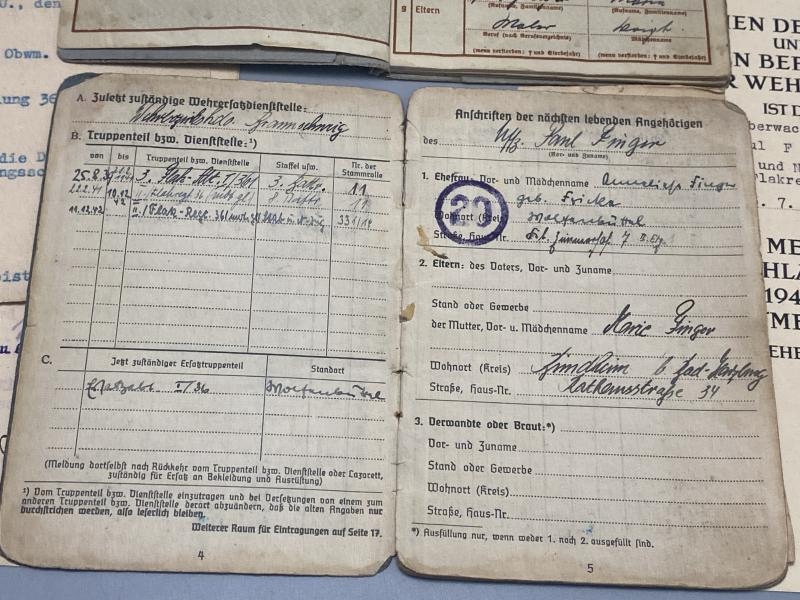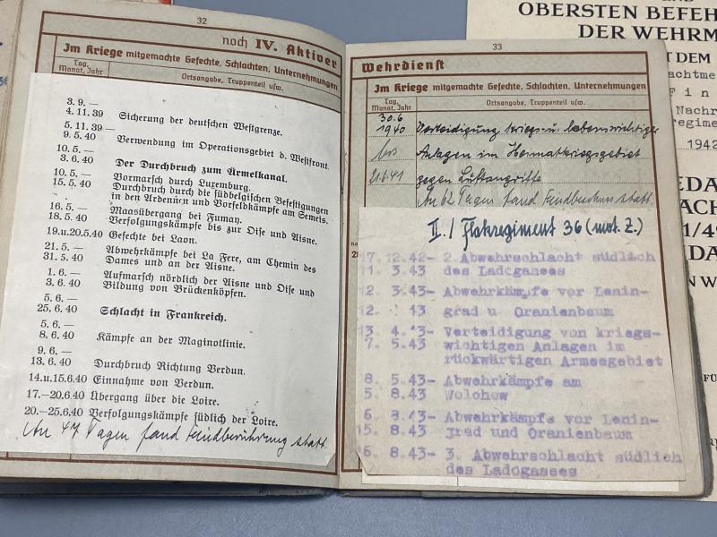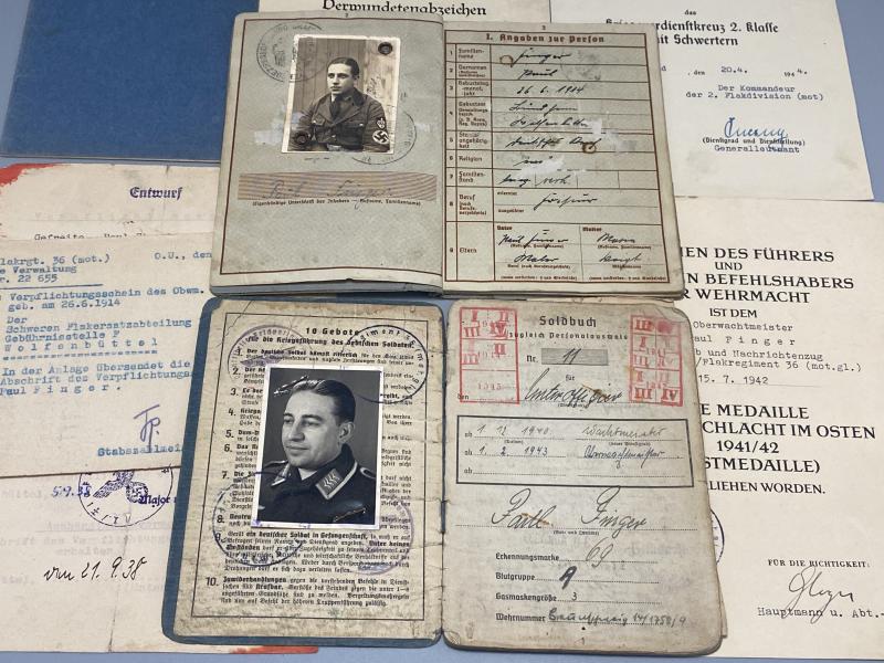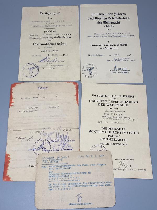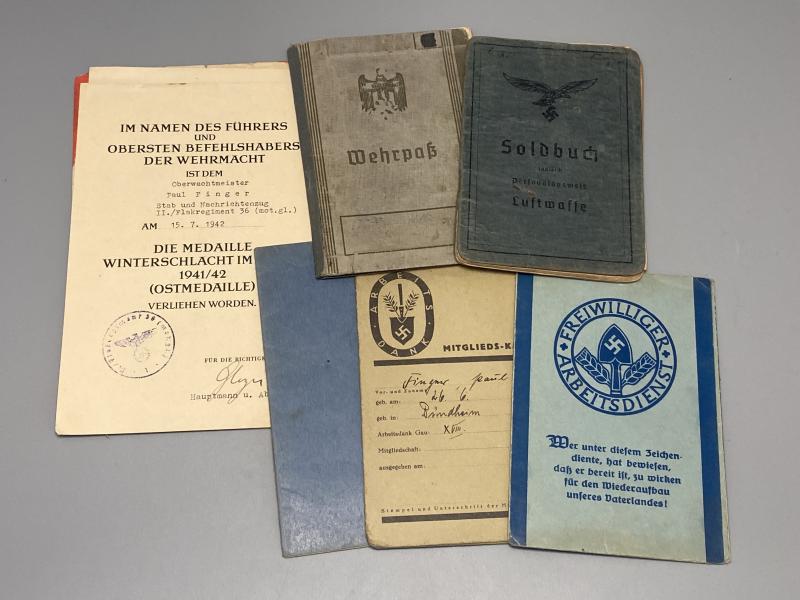 Large paperwork grouping to Luftwaffe Oberwachtmeister Paul Finger of Flak Regiment 36 and 361 (both motorised). Fingers career started is a barber in 1932, stated in his hairdressers & wig makers association book. He later joined the RAD as a volunteer in 1935. After completing service he joined the German airforce where he was attached to Flak Regiment 361. He served in the invasion of Poland in 1939 and then France in 1940. Finger was posted to the eastern front in 1941 for the upcoming operation Barbarossa. Includes with this 1942 he was stationed near Leningrad and later fought at Ladoga in 1943. In October 1944 his unit was posted to the Kurland pocket where he was hospitalised. The unit was destroyed here and remains were attached to the new 408 Volks Artillerie Korps. The 408 Volks-Art were stationed to defend Germany until surrendering to the Russians in 1945.