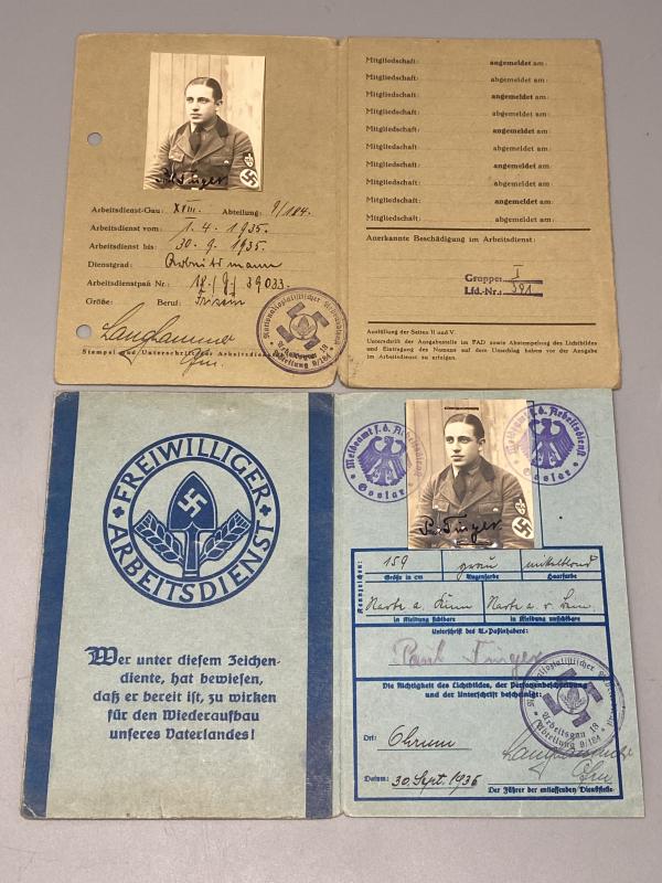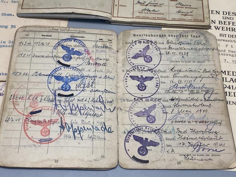 In this grouping is Fingers Wehrpass & Soldbuch. Both full of entries. Two RAD members books, Fingers hairdresser association book, some loose paperwork and three of his award citations. These citations are for the wound badge, merit cross with swords and the Eastern front campaign medal.
