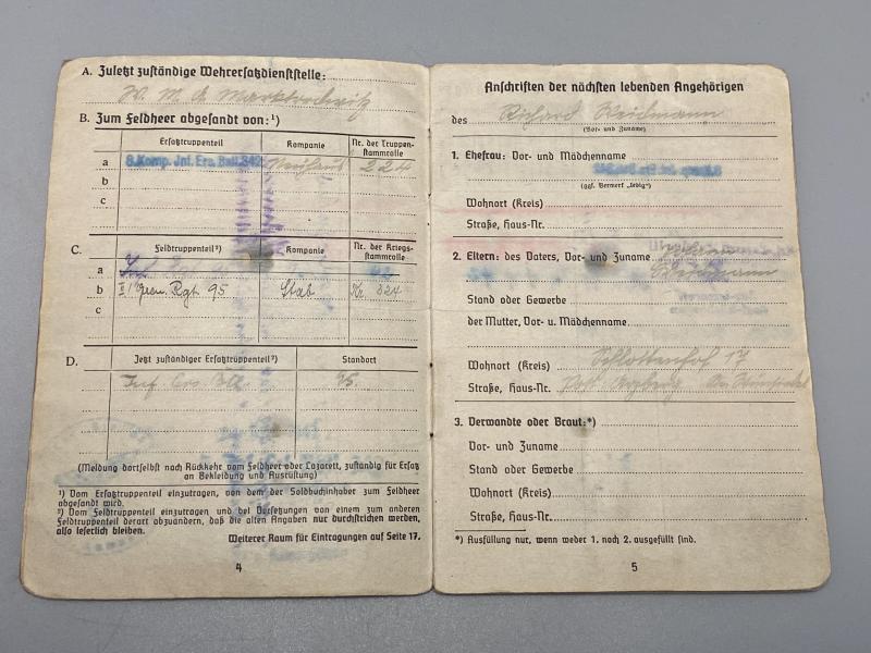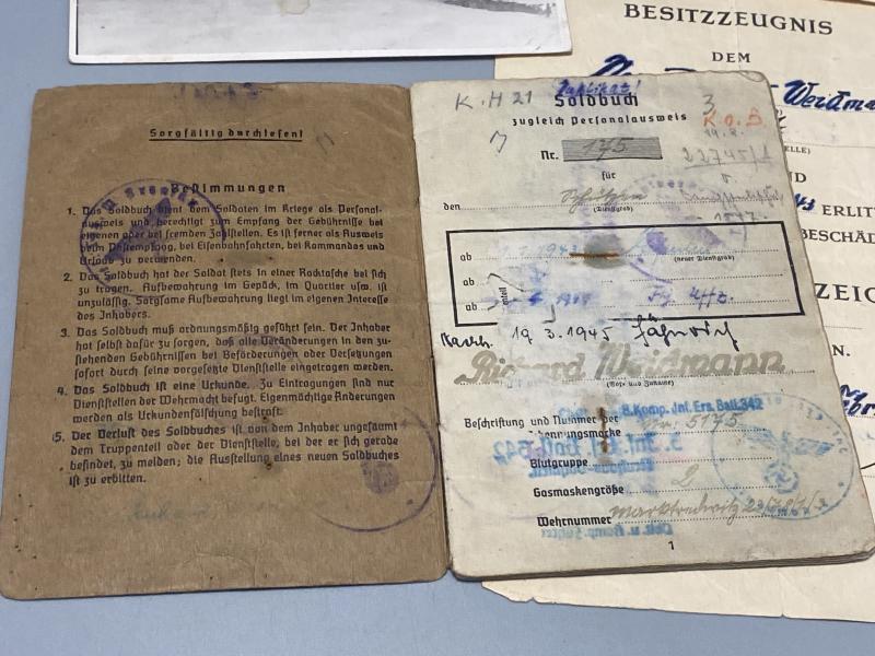 Original German army Soldbuch to Unteroffizier Richard Weidmann of Inf.Ers.Btl.342 and later Gren.Btl.95 which served with the 17th Infantry division on the eastern front. Weidmann enlisted with the army during the units stationing in France in 1942. By April 1943 the division returned to the eastern front fighting at Mius, Nikopol, Uman, Kishinev and Jassy. By August 1944 the unit was transferred to Poland in the area of the Vistula river. The division suffered heavy losses here in January 1945 during the Soviet Vistula-Oder offensive.