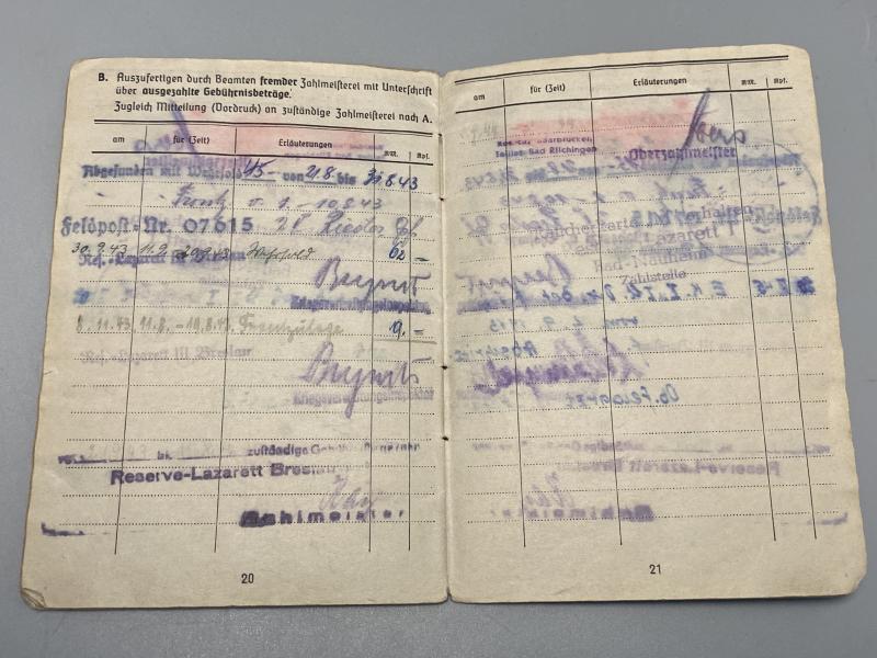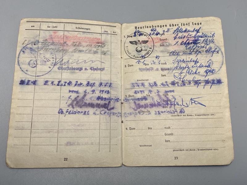 Included with his Soldbuch is his original hand written citation of his Wound badge in Gold. The signature matches that of the officer in his Soldbuch. Unfortunately the Soldbuch was water damaged at some point and all of the paper was affected. It appears Weidmann over wrote on important details of the book including home details, pay and his Wound badge certificate. Due to the water damage the photo is missing. It appears the wetness stuck it to the first page.