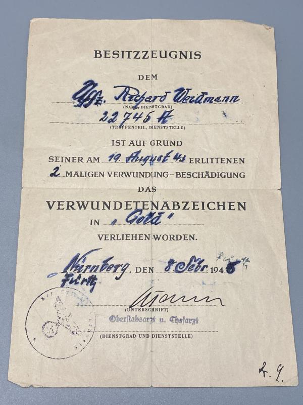 In the Soldbuch there is an abundance of entries. Several injuries are listed in the book and it appears he was seriously wounded in September 1944 as he never returned to the frontline after this. In February 1945 Weidmann was issued the wound badge in Gold and on the 20th recieved the Iron Cross Second and First class simultaneously. His bravery must of been that good to have received both Iron crosses and the wound badge in Gold. Weidmann was discharged from hospital well after the end of the war in September, 1945.