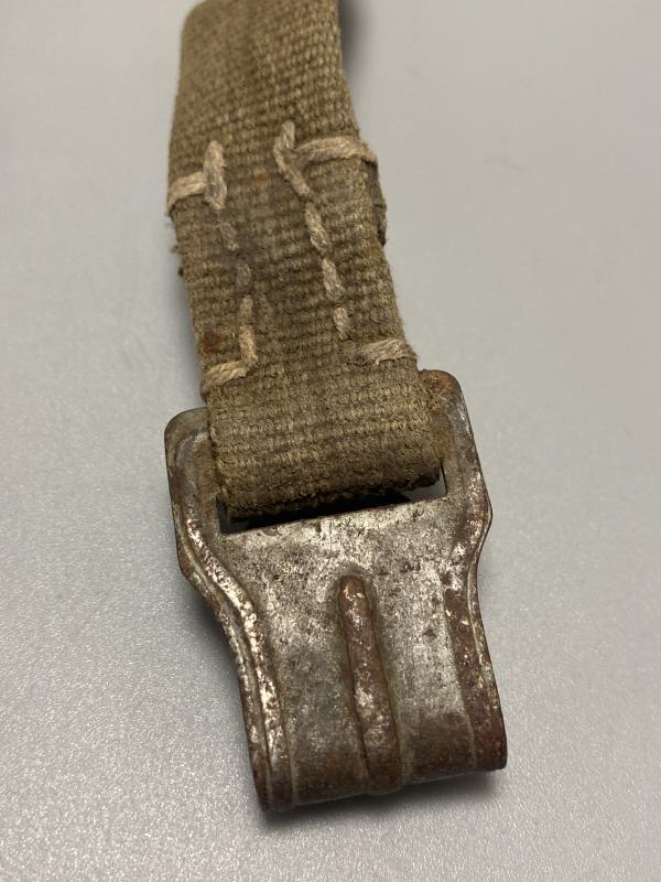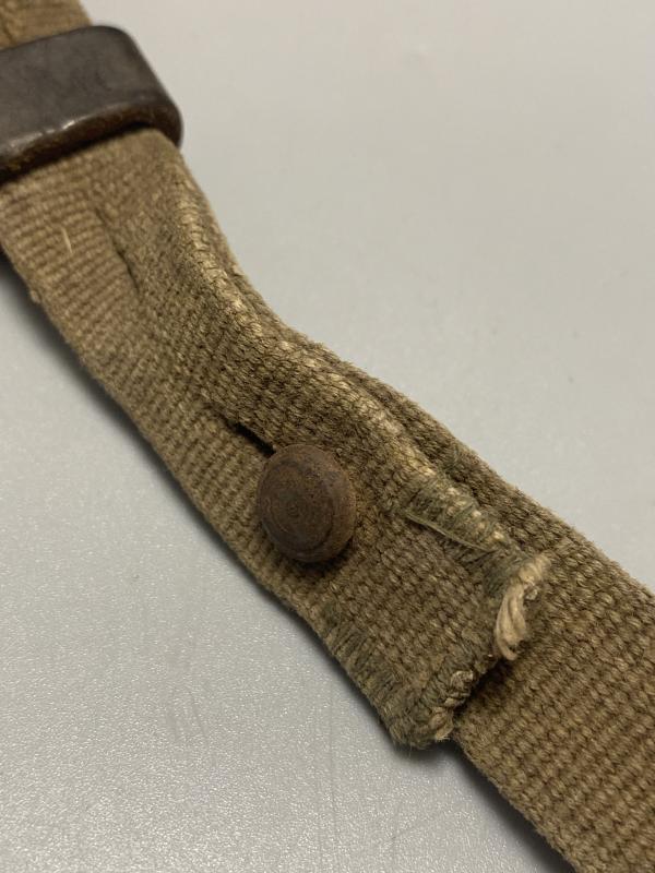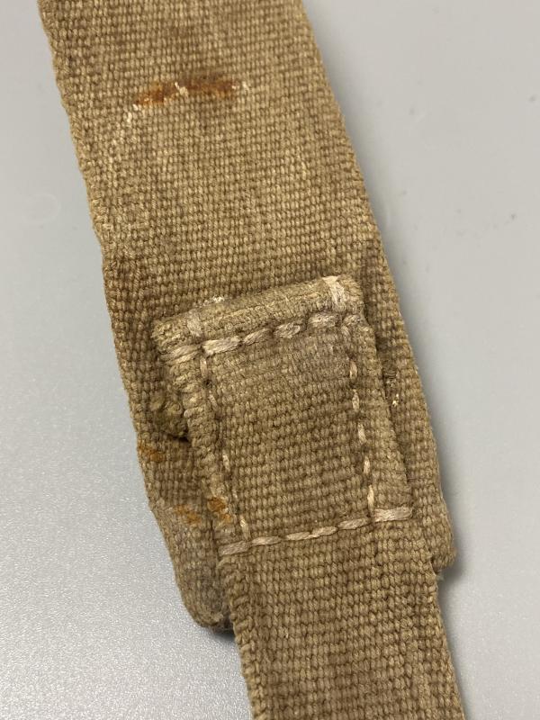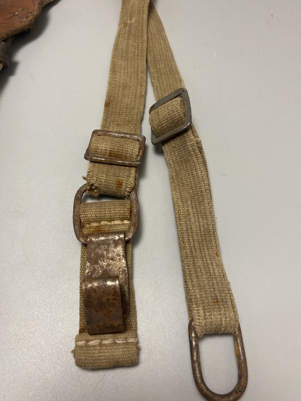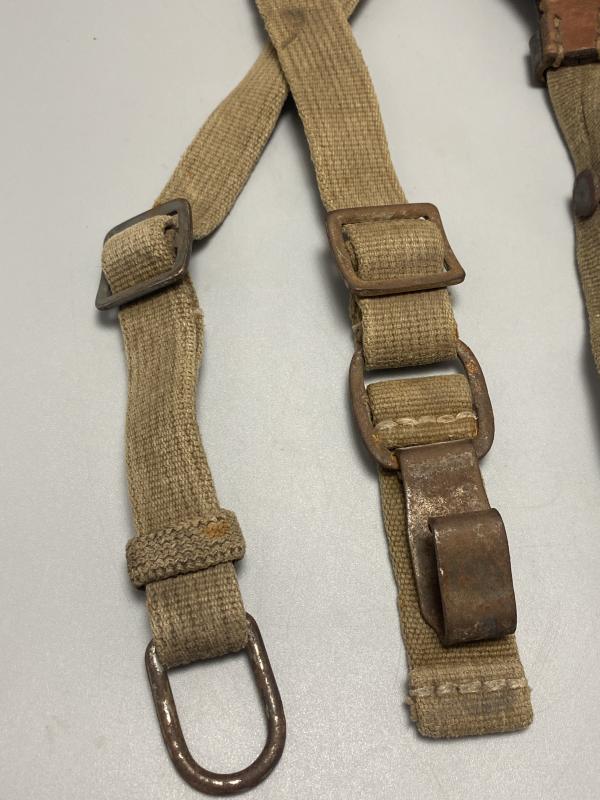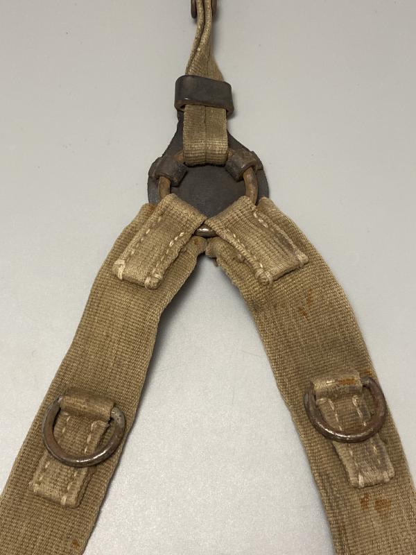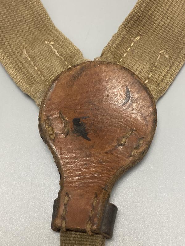 Original pair of German army canvas Y Straps as used by all branches of the Wehrmacht and SS during the war. This type was also worn at the later stages of the Afrika campaign and Südfront. Y straps made of a heavy tan canvas with steel hardware with remains of grey green paint. Leather to the rear of the straps in good shape with both loops still attached around the ring. Straps so signs of use with some staining and ware however a really nice complete example without alterations or damage. Normally a date stamp and code is present on these however none can be seen except a faint stamp on the reverse of the leather. Despite this an absolute textbook example of some exemplary and rather uncommon Y straps.