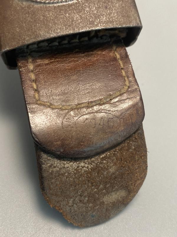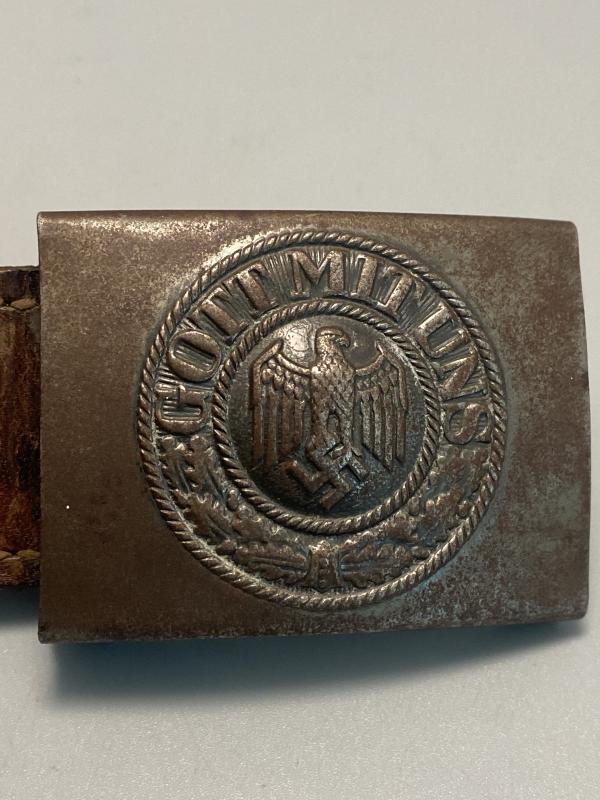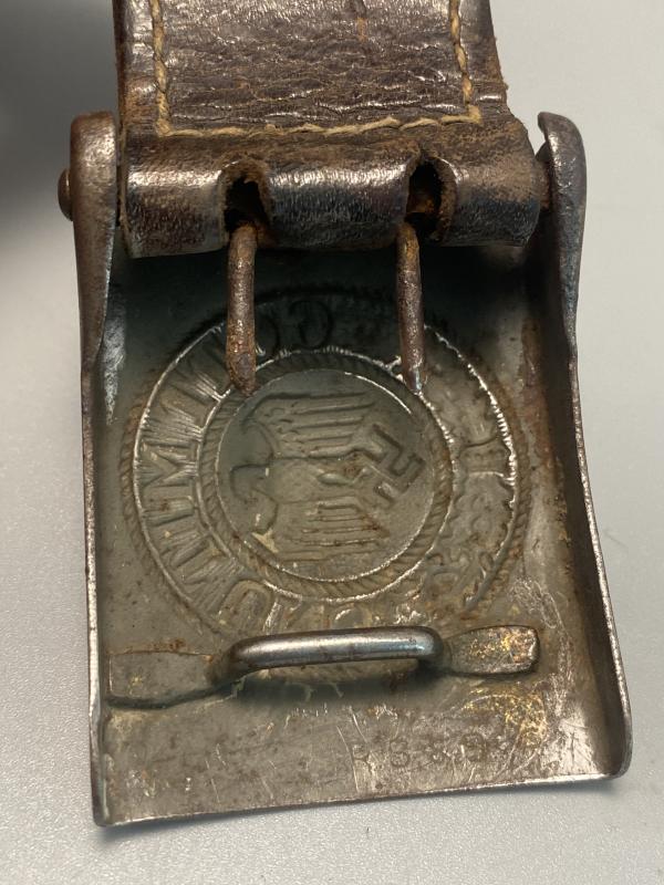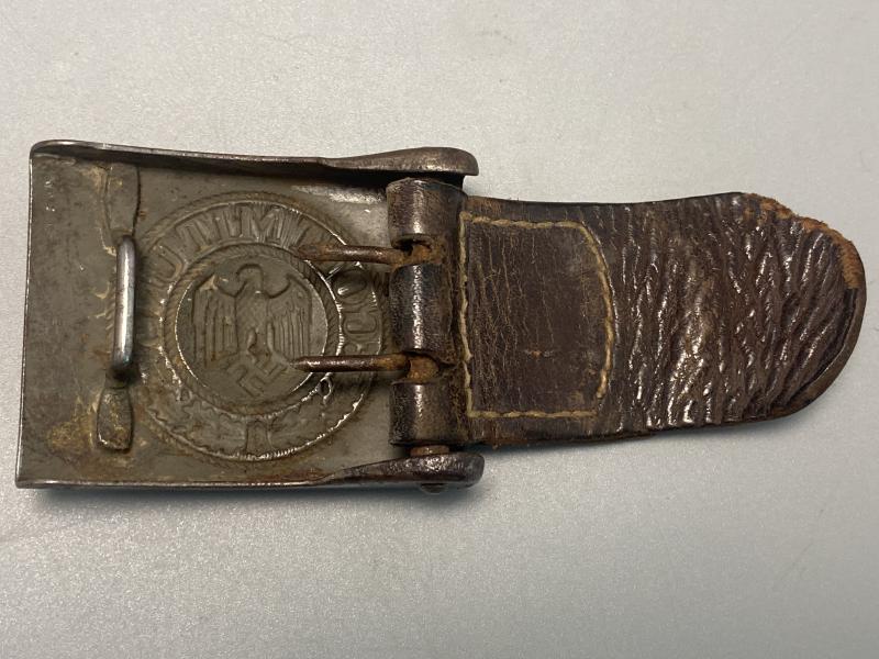 Original hard combat worn German army belt buckle complete with brown leather tab made by Richard Sieper & Sohn 1940. Steel buckle has lost a lot of its finish on the front however combat paint visible on the reverse with the makers stamp. Leather tab slightly detached however present and baring markings for RS&S and the manufacture year of 1940.